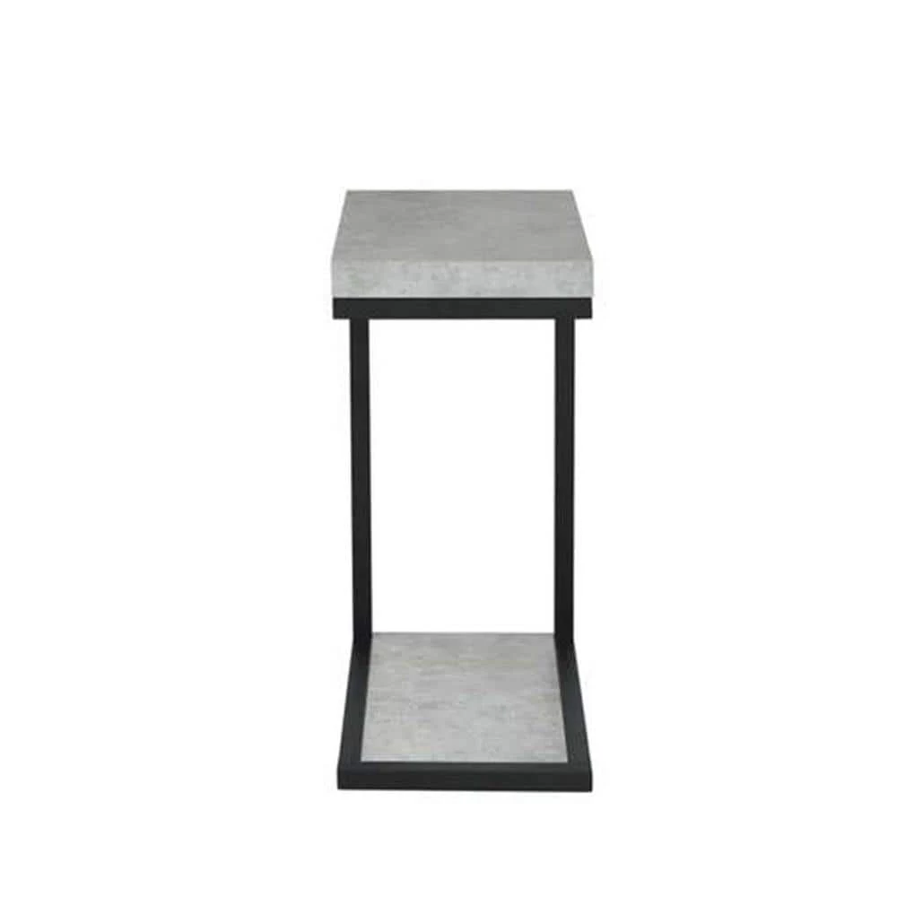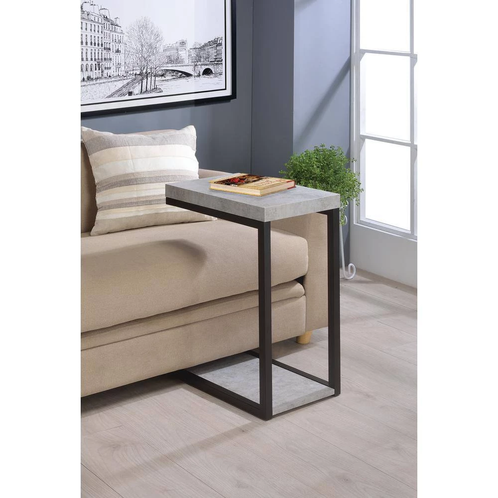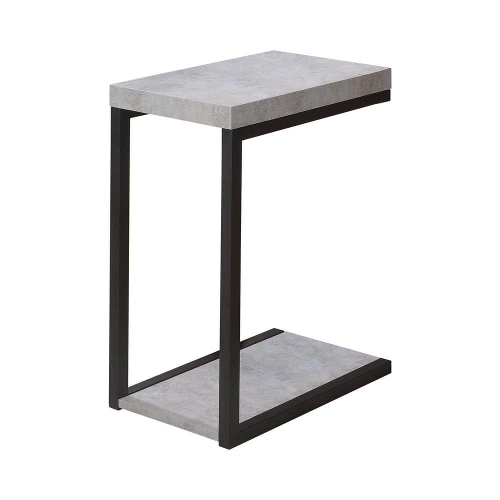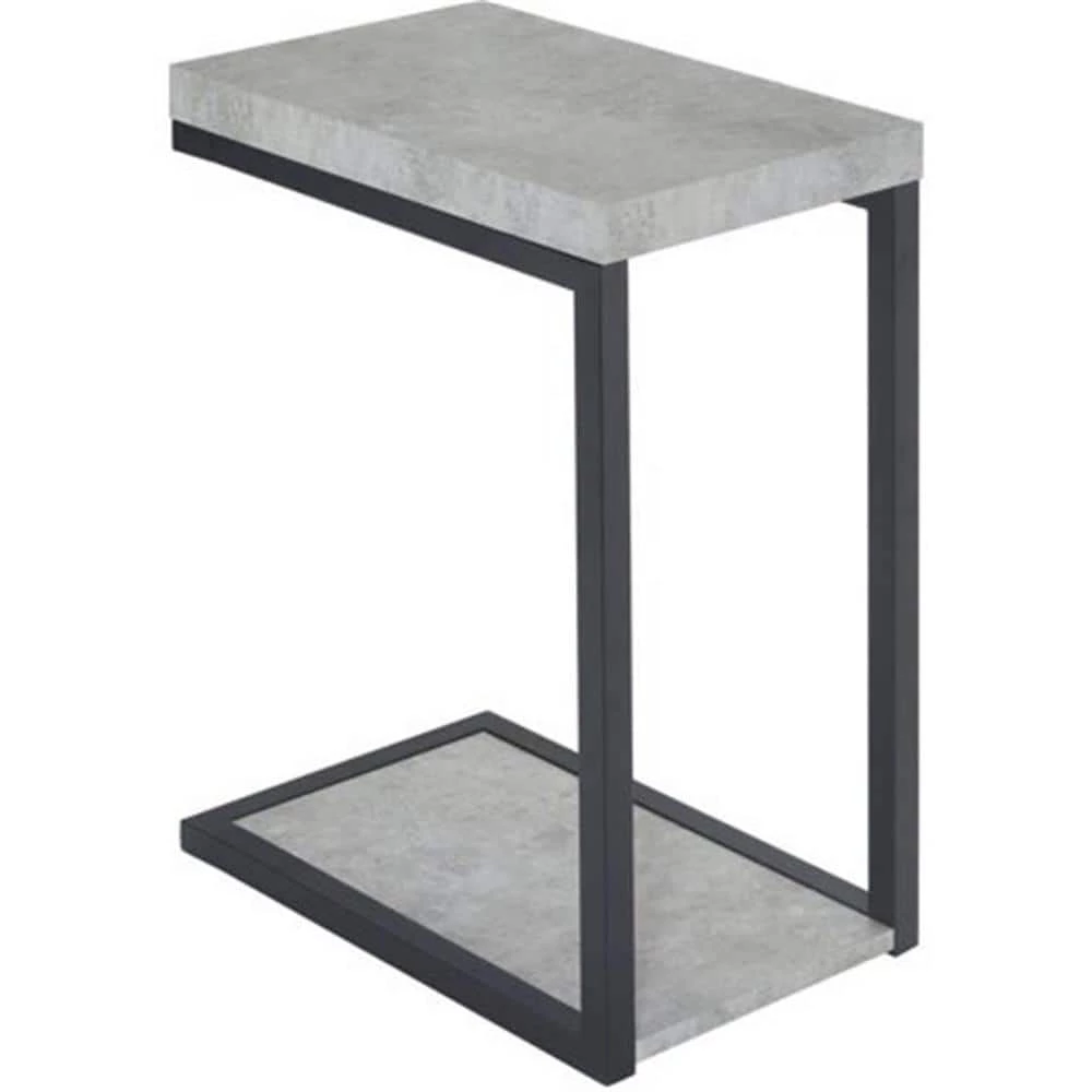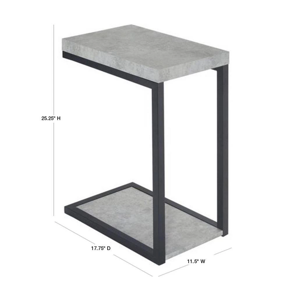 Perfect for a modern living area, this sleek snack table is full of industrial details. Dark and flat, the metal base and legs are full of structure. Thick and defined, the faux cement top sports a warm hue that looks great when paired with delicate features. Bold angles and industrial hues create a depth-filled piece that is perfect for using with a sofa or chair. Add depth with the subtle variations in visual texture from the table top.