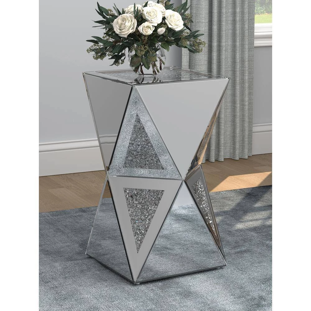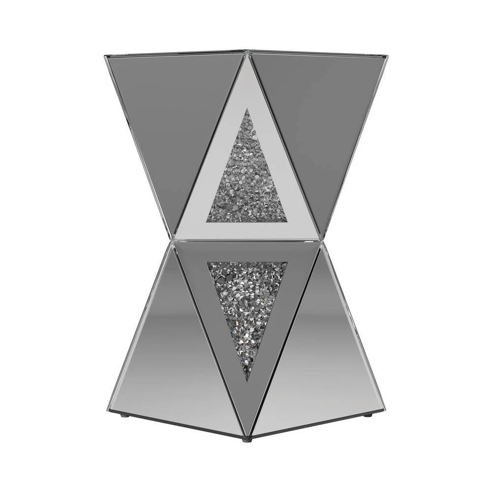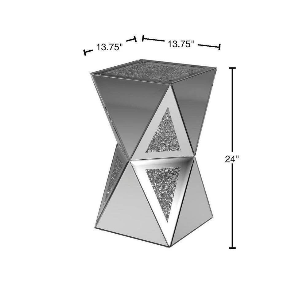 Revel in the eccentric style that is contemporary glam with this side table. Geometric design and unique shape make this a conversation piece. Celebrate the modern style with the architectural appeal. Elegant silver finish presents opportunities for matching with other pieces. Bring this eccentric side table home to stimulate discussion.