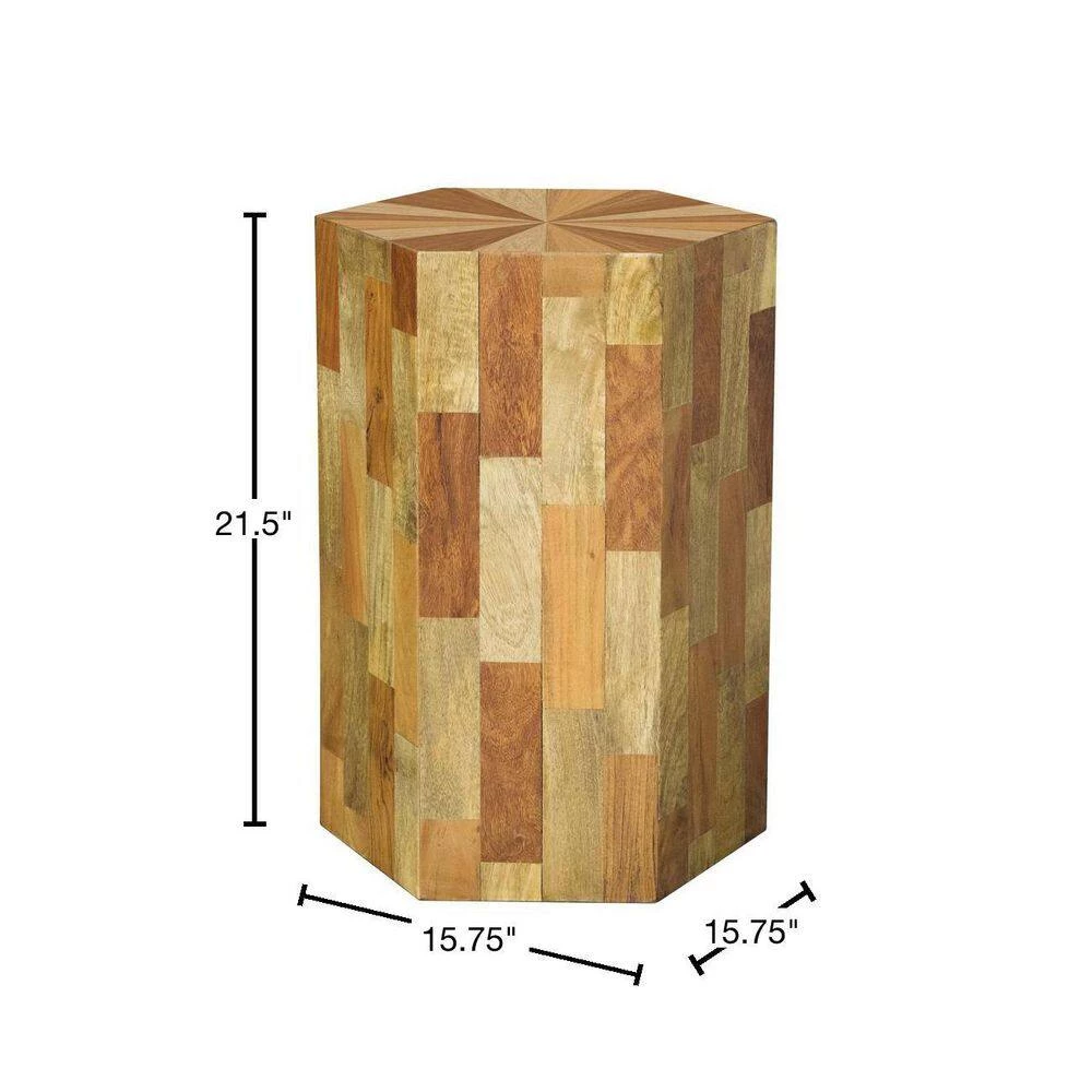 A hexagon shape lends an edgy, contemporary look to this wood transitional accent table. Perfect for a boho-inspired home, this accent table is made entirely of solid mango and acacia woods. Featuring a multi-tone plank-like pattern across the sides and a sunburst across the top, it offers a striking natural flair with contrasting colors. A flush base offers extra support for decor or a small accent lamp. Place this end table inside a rustic style home for a modern touch.
