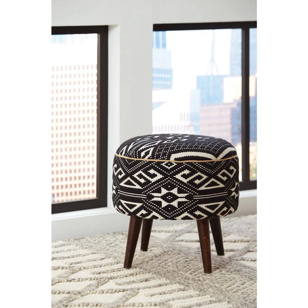 Enjoy the eclectic vibes from this ottoman with wood legs, highlighted with interesting patterns covering its upholstery for visual appeal. Coming in a contrasting black and white color palette, tan piping trim offers the perfect contrast. This ottoman is cushioned for comfort and provides a stylish alternative seating option. Supported on tapered legs, this ottoman offers a hint of mid-century modern style. Use this piece in a living space, home office or bedroom.