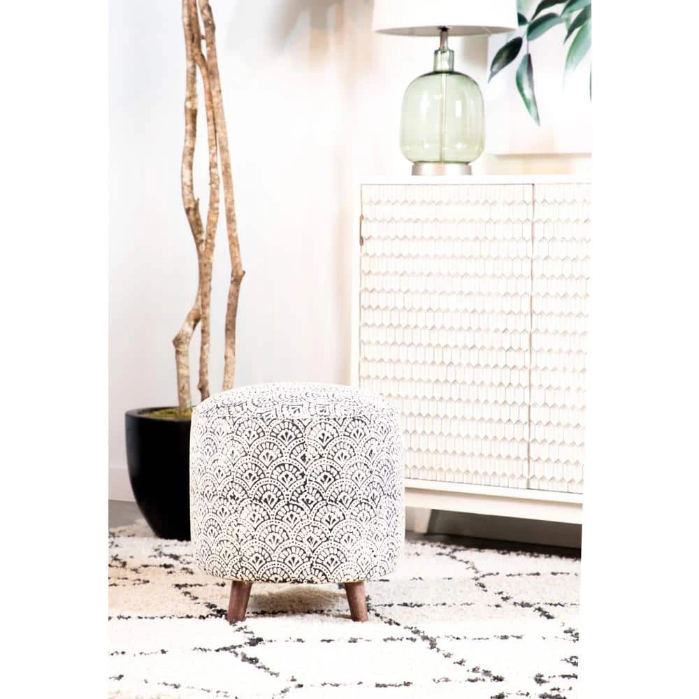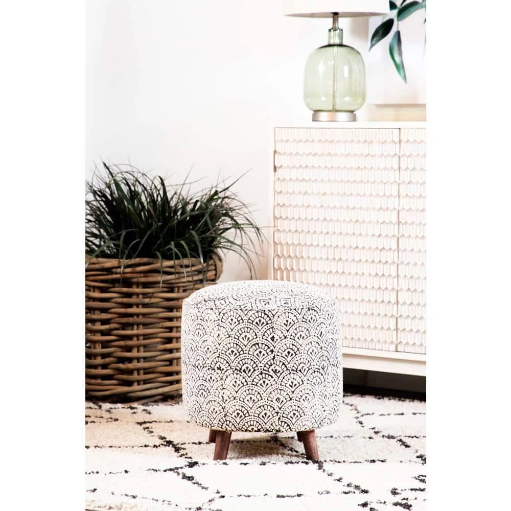 Distressed ink block patterns bring this accent stool to life. Its simplistic rounded design makes it ideal to use as a seat or propping up your feet. This piece is upholstered in soft woven fabric with a slight texture. Tapered wood legs provide support and extra stylish appeal. Use this piece as an accent in eclectic style living areas and bedrooms.