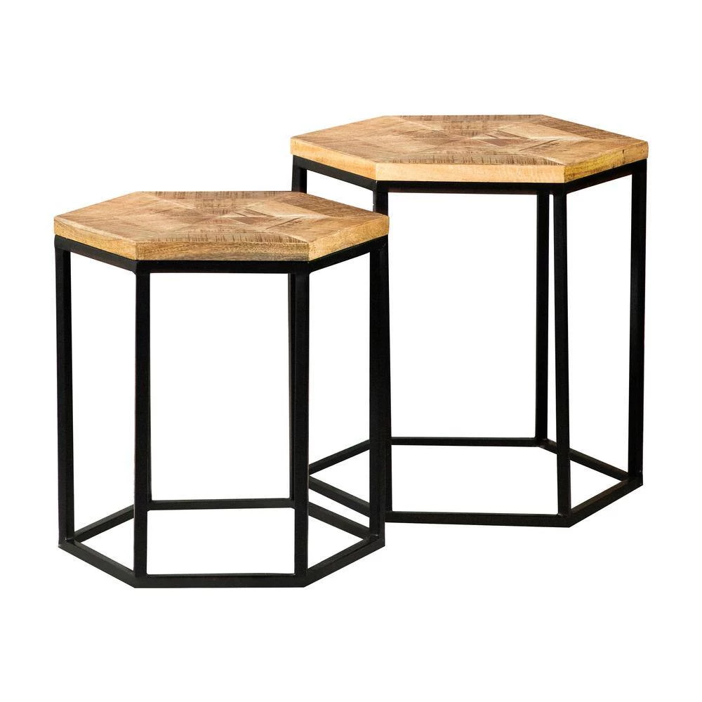 Go geometric with this set of 2 nesting tables. The wood hexagon tabletop makes its own display in your living area. Enhance the function of this piece by placing decor and small possessions on top. The matching black metal frame takes on the same hexagon shape with slim yet sturdy legs. The second nesting table brings extra space to display decor.