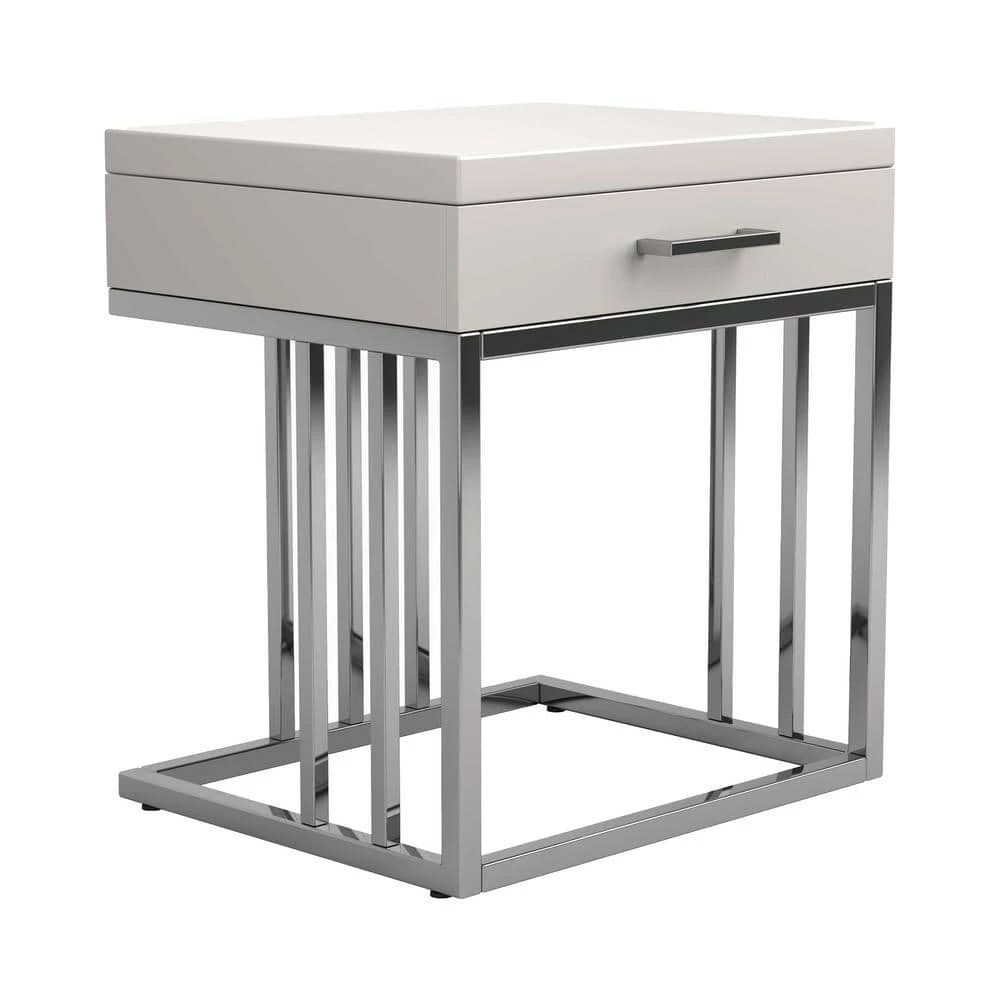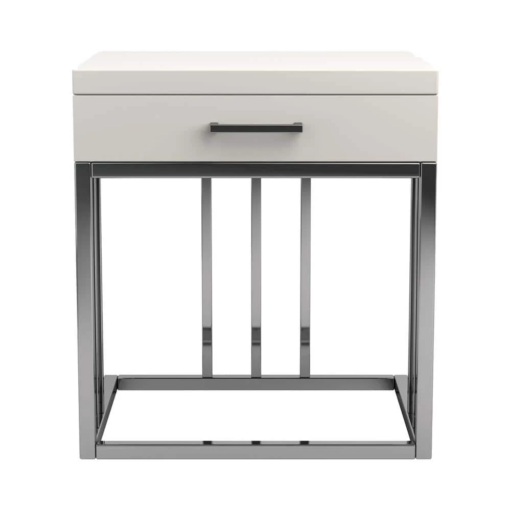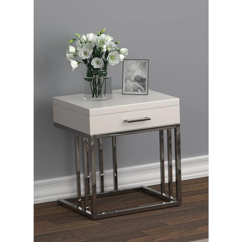 Display your flair for the contemporary with this end table. Glossy white tabletop and chrome finish create a blend of functionality and elegance. Modern linear design adds sharp detail to your space. Easy to open drawer allows for storage and organization. Can match with coffee table and sofa table from the same collection.