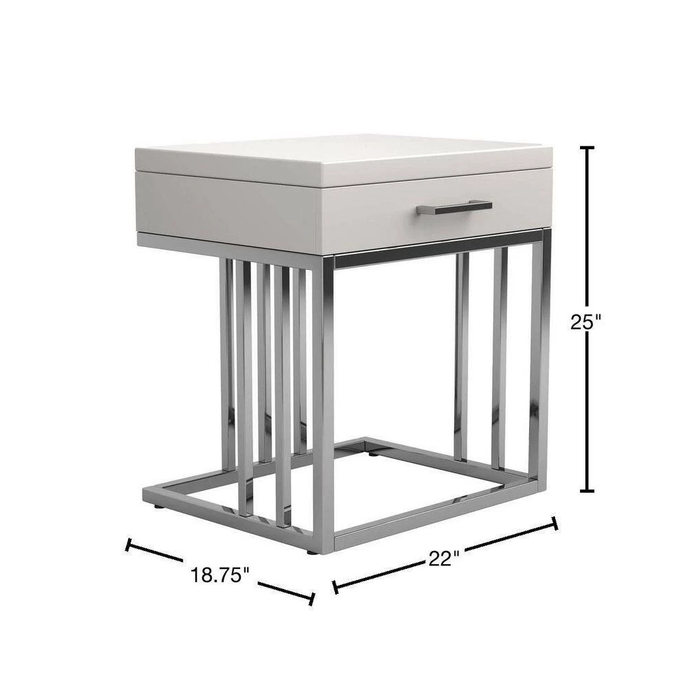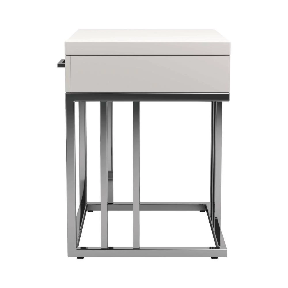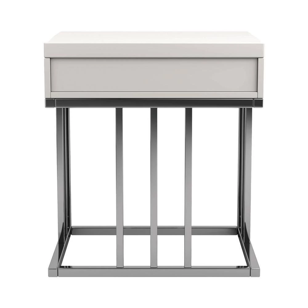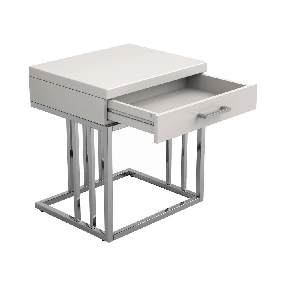 Display your flair for the contemporary with this end table. Glossy white tabletop and chrome finish create a blend of functionality and elegance. Modern linear design adds sharp detail to your space. Easy to open drawer allows for storage and organization. Can match with coffee table and sofa table from the same collection.