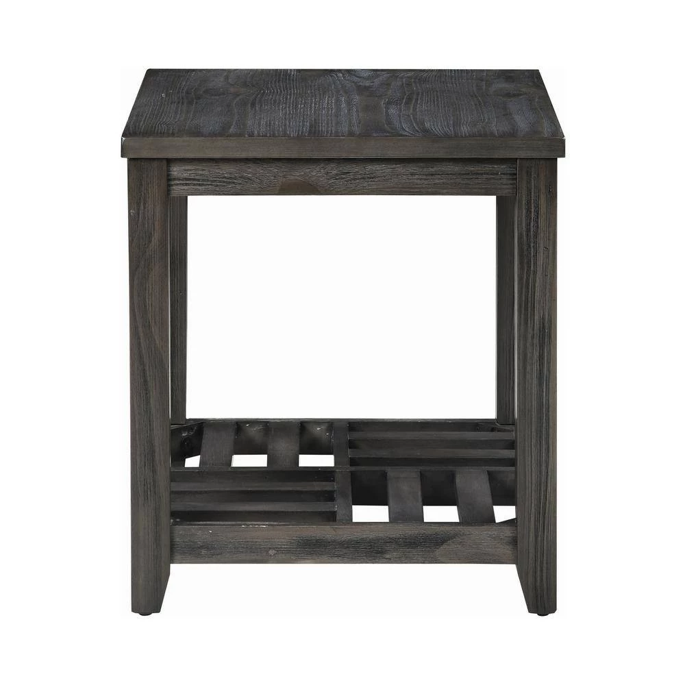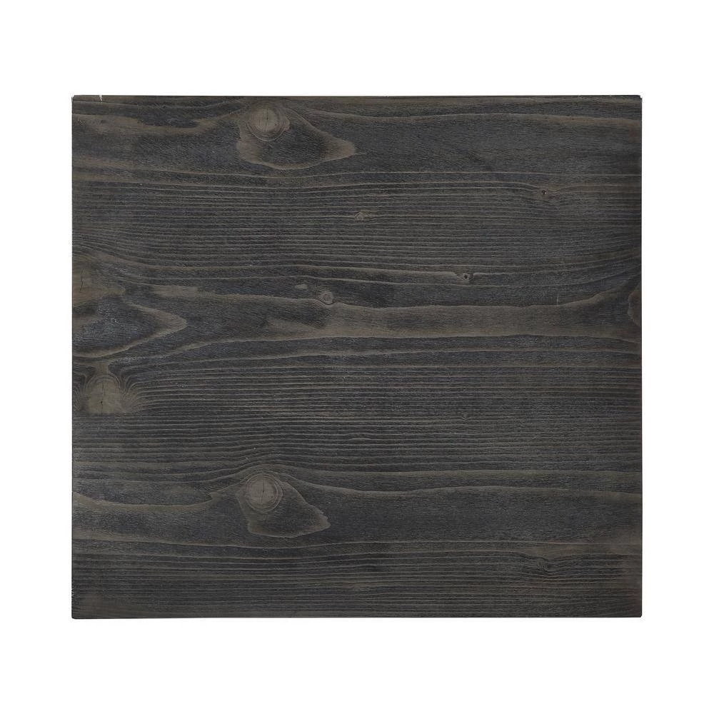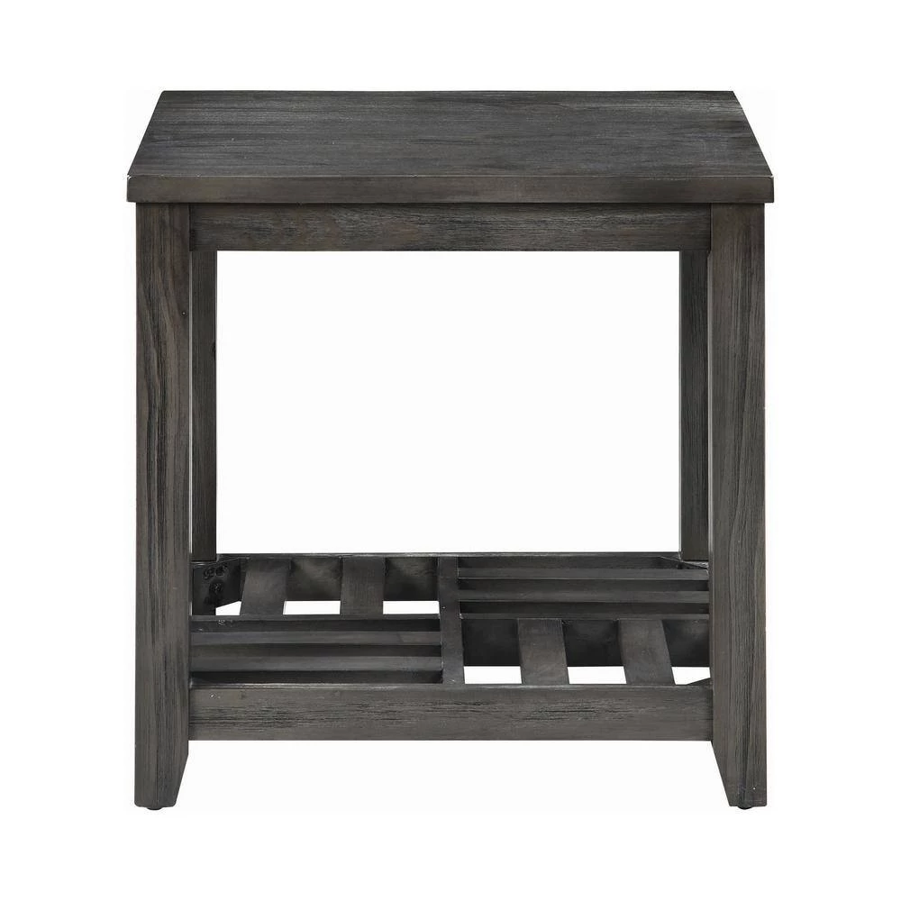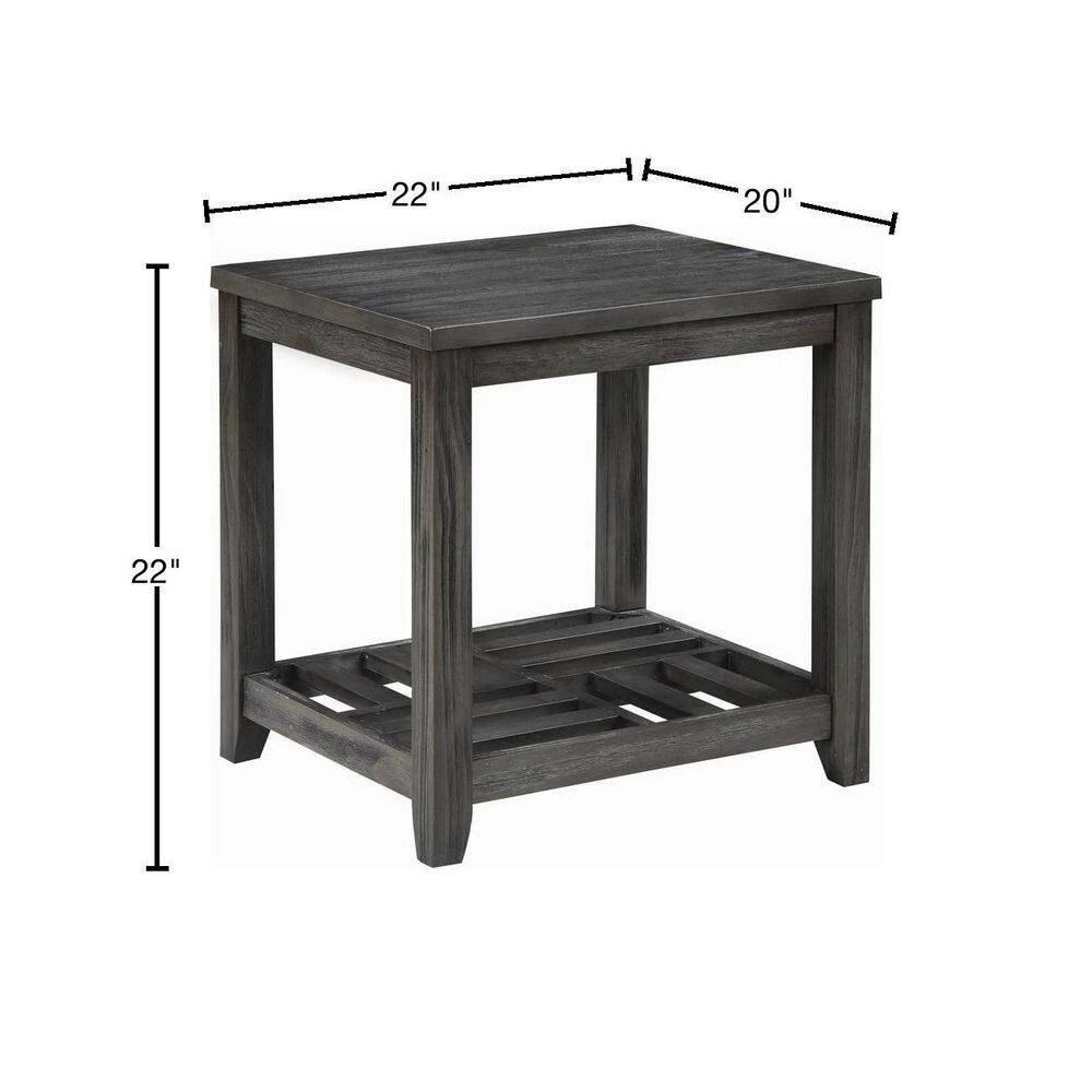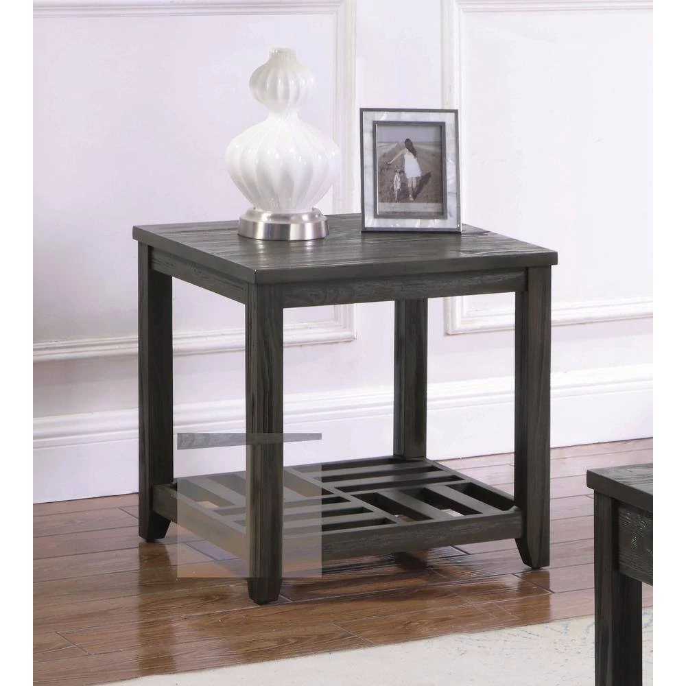 This solid-constructed end table has a simple design that’s perfectly suited for any living room decor. Square table top offers space for a table lamp and a decorative vase. Four straight legs with clean lines taper at the bottom. Bottom shelf features a checkerboard design with a perpendicular twist design. Finished in grey with wood grain accents.