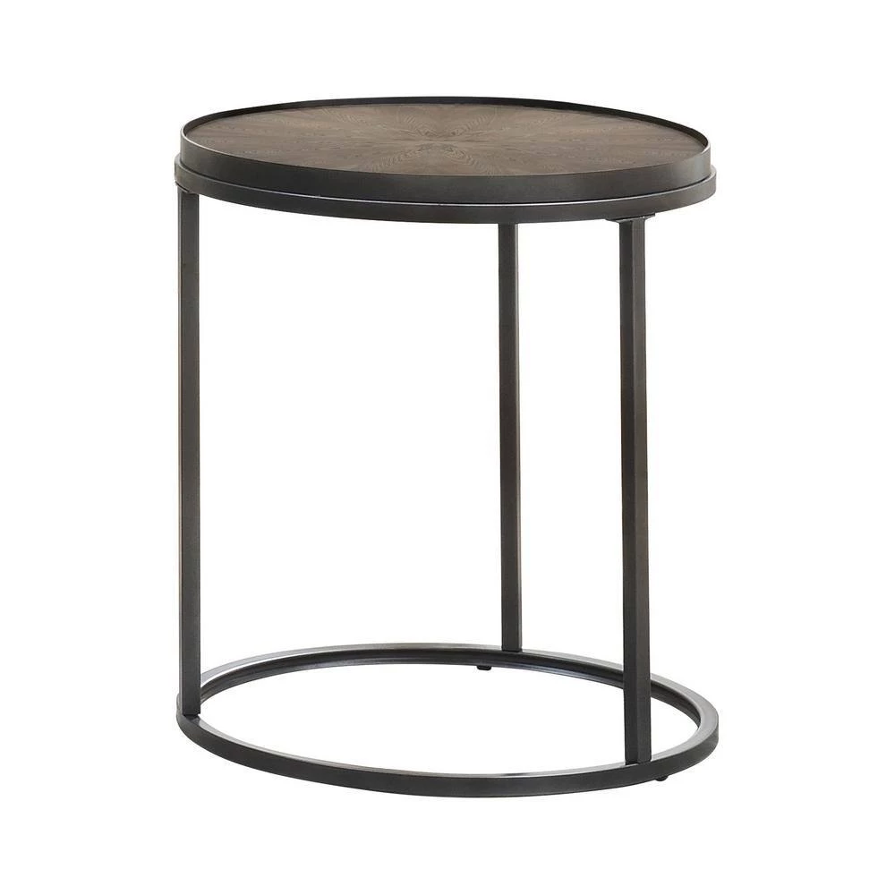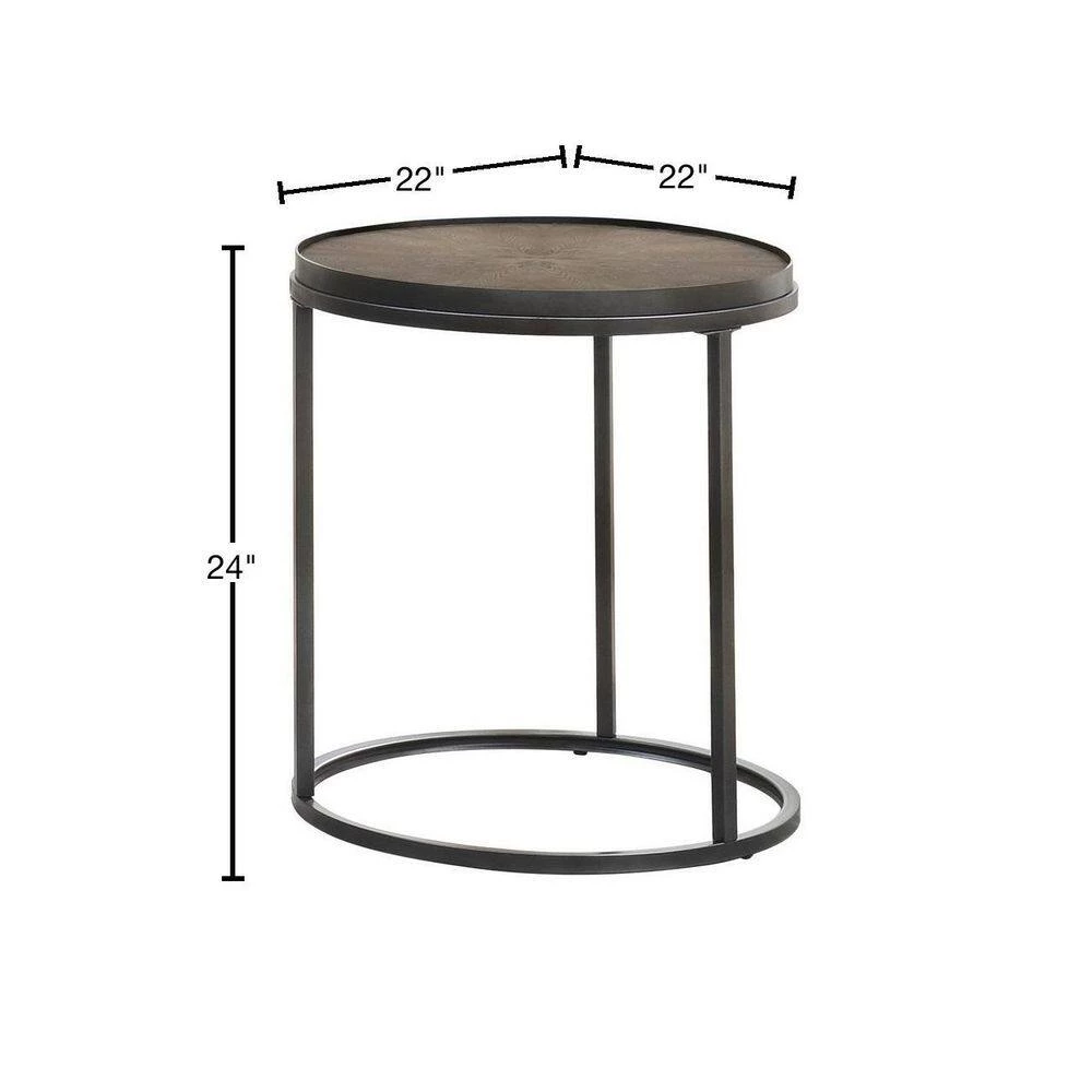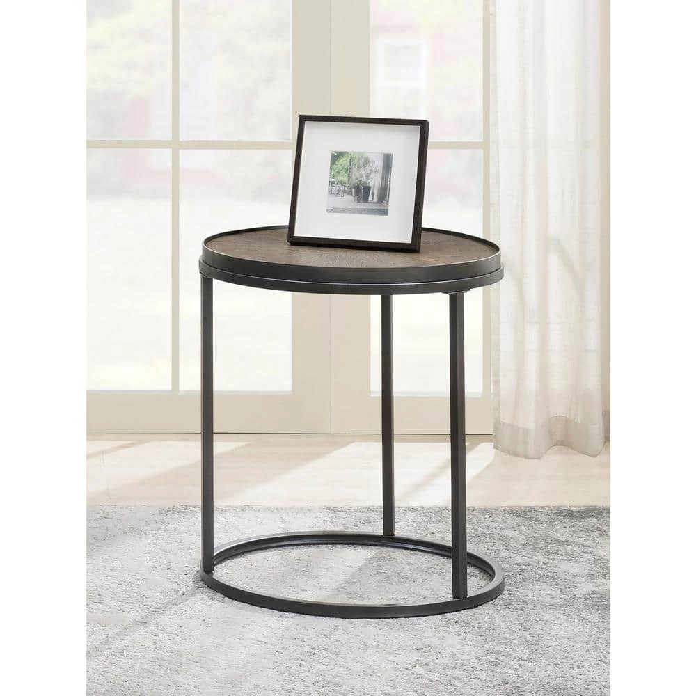 Update a living room with cool, classic convenience. This rustic table boasts a weathered elm top over a bold, black base for striking visual appeal. The metal base adds an industrial edge to its simple design. The graceful, circular top and base create a clean, cohesive look. This lightweight end table can be easily moved around a room to add sturdy surface space wherever you choose to place it.
