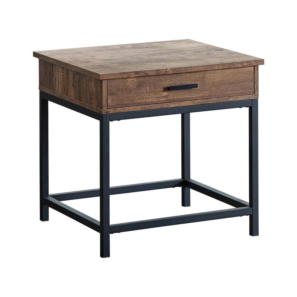 Overhaul your living room with a rustic and modern end table. The straight legs on the black metal base perfectly complements the brown finish. Enhanced with wood grain patterns, this storage end table brings stylish flair to your space. A single drawer can easily conceal small items such as remotes and reading materials. Use this piece next to your favorite armchair for its stylish silhouette and storage options.