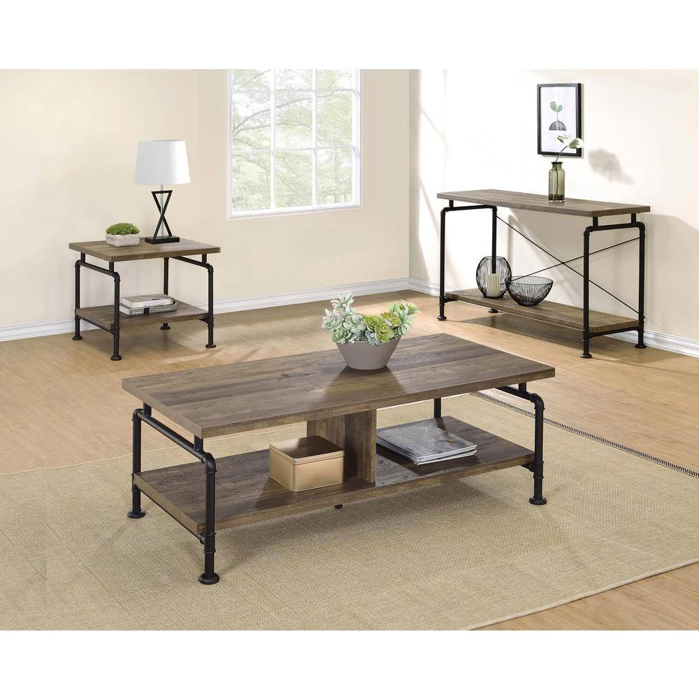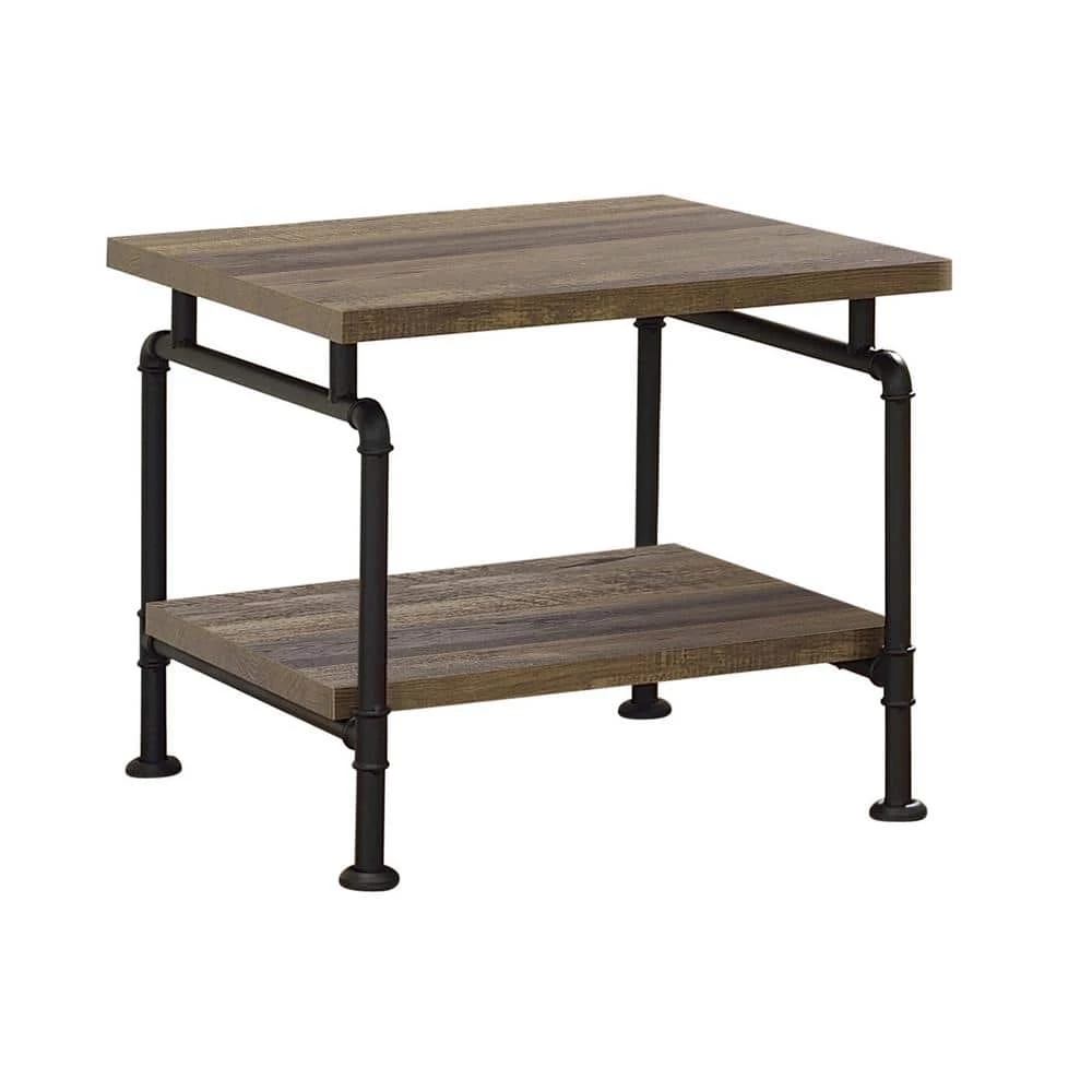 With mixed materials, this end table lends itself nicely to an industrial style loft apartment or modern farmhouse style home. Supported by metal industrial pipe styled legs in a black powder coat finish, it offers a striking contrast. Each tabletop surface is crafted of engineered wood and offers a rustic oak finish that lends a subtle country charm. In addition, a spacious lower storage shelf invites you to showcase photo books and cherished items. Place a pair of these end table next to a leather sofa for a handsome, refined look.