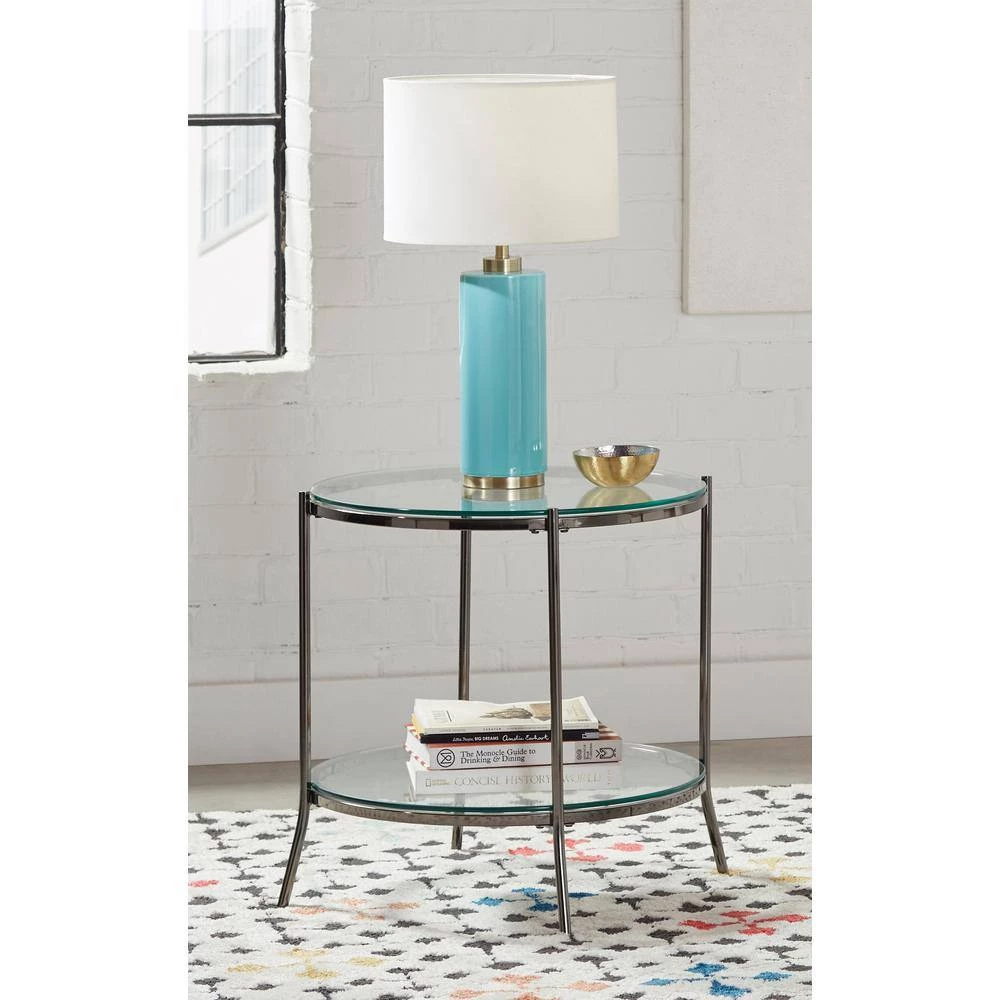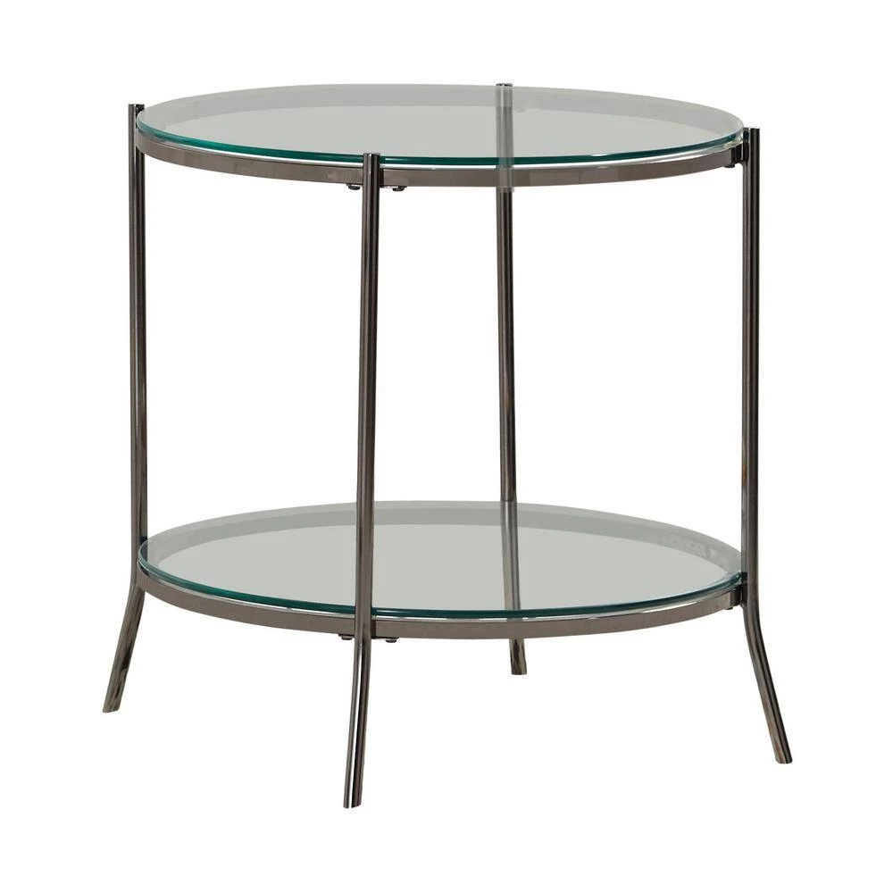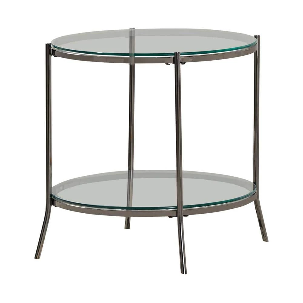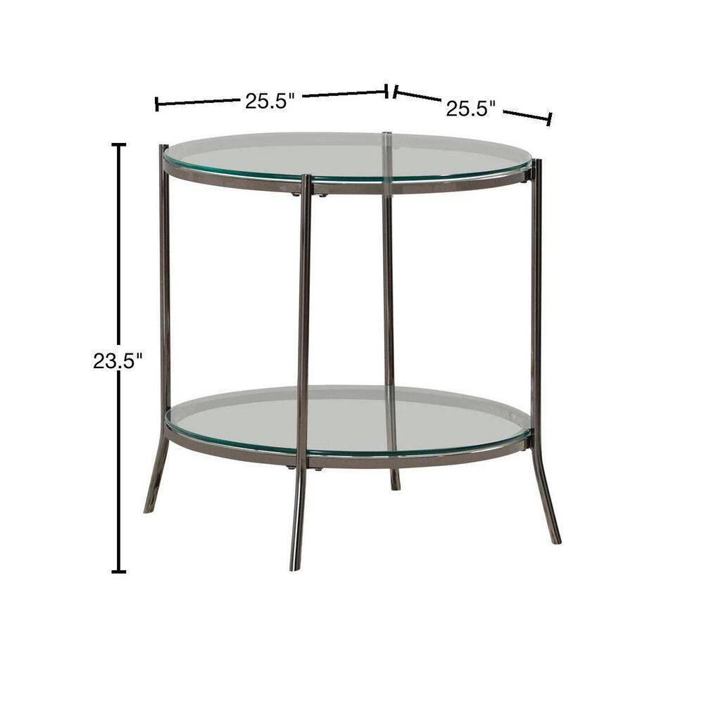 The sleek lines and open and airy design of this end table elevate and refine any seating area. Flanking a sofa or nestled beside an accent chair, this contemporary end table exudes a confident modern flair in its simplistic shape and style. Featuring a round shape, complete with a clear tempered glass tabletop and bottom shelf, this end table offers an elegant nature that blends into its surroundings. Held together with a slim electroplated metal frame and four leg supports that flare at the foot, each in a black nickel finish, this transitional end table complements a variety of color palettes and decor. Place it in a modern living room or even a bedroom seating area.