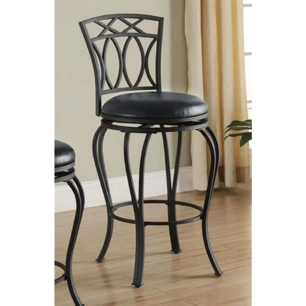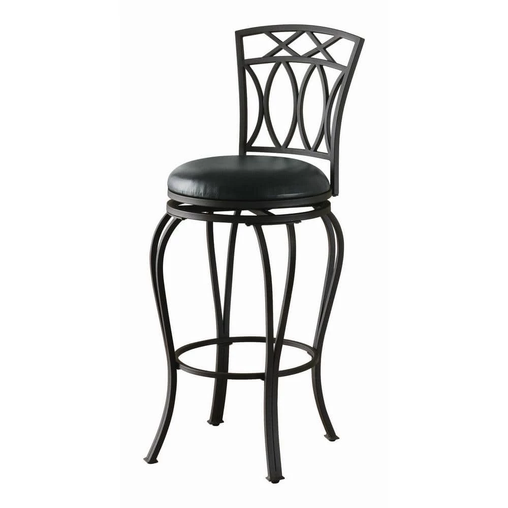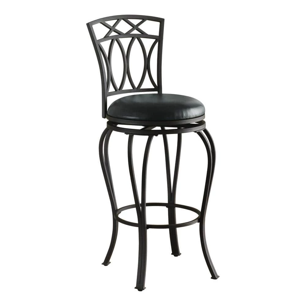 Introduce a decorative touch with the stylish presence of this metal barstool. Complete with a swivel seat that facilitates conversation, this barstool delivers transitional style with timeless appeal. Curvy legs surround a built-in footrest. A rounded seat is comfortably padded and wrapped in black faux leather for a rich touch. A decorative backrest adds detail to your decor while ensuring a supportive and enjoyable seating experience.