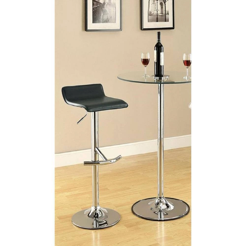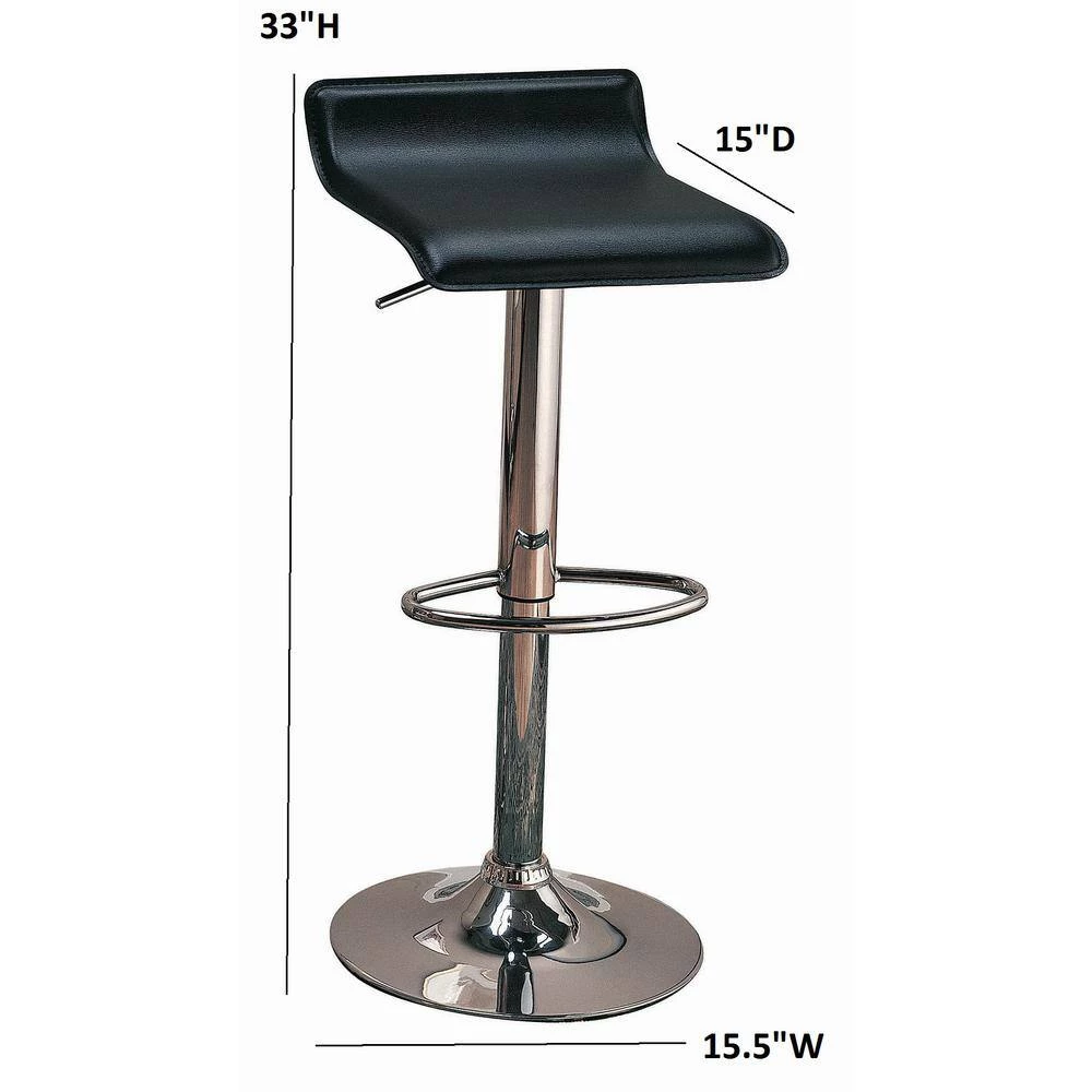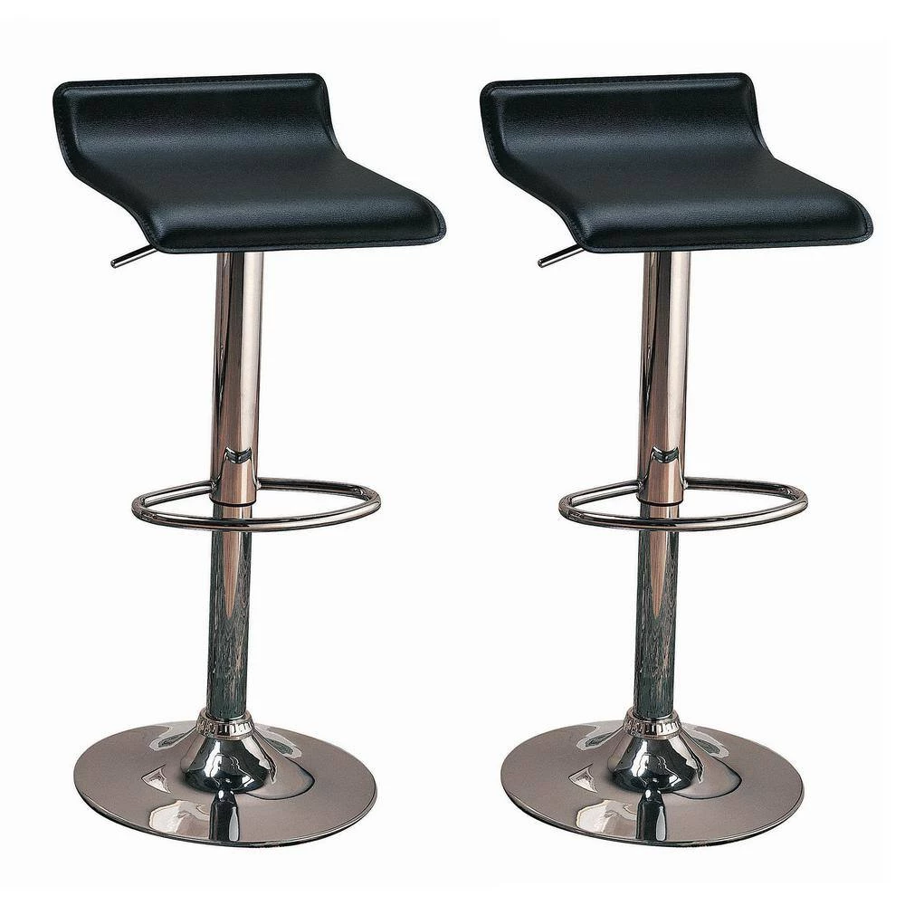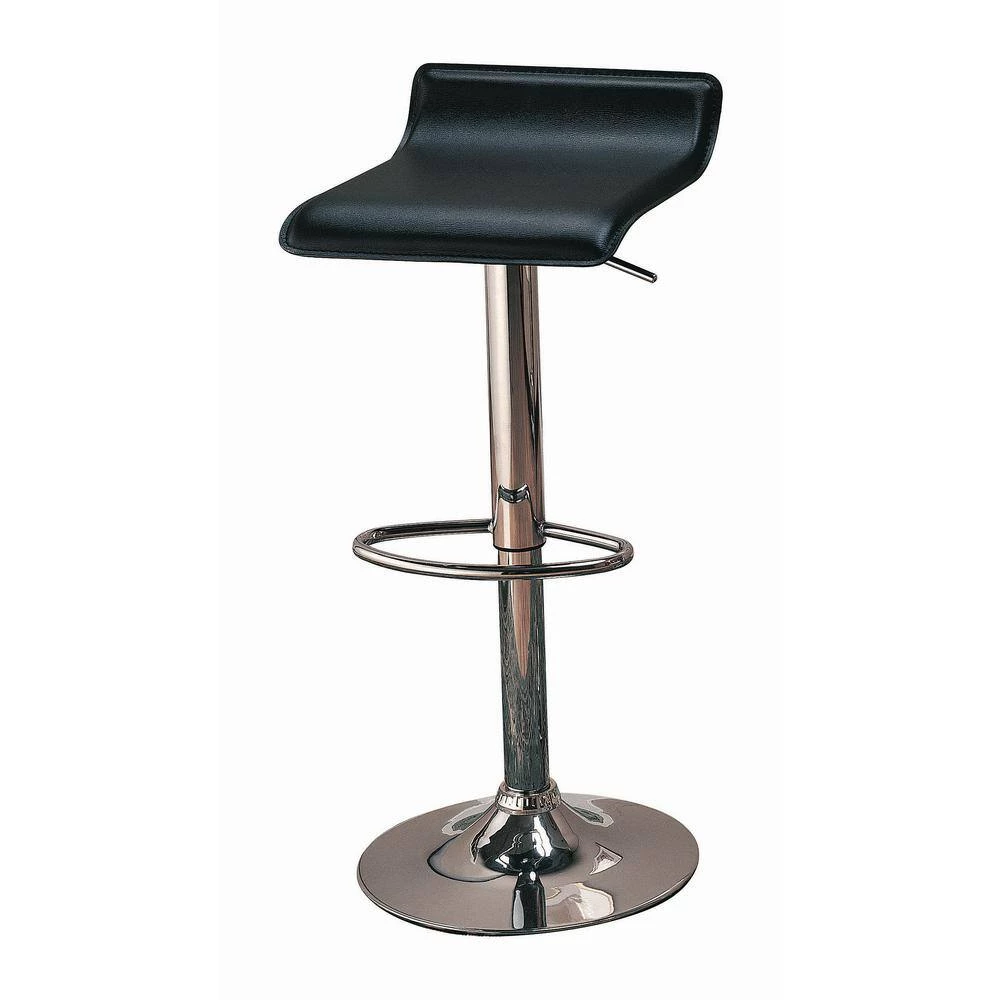 An adjustable barstool with a modern silhouette is a beautiful upgrade to any kitchen or lounge space. Featuring black upholstery, the stool features a curved seat that offers just the barest hint of a back. The seat is height adjustable to accommodate a range of table and counter heights. A chrome finish lends gleaming appeal to a pedestal base. A built-in footrest provides a final touch of comfort and support.
