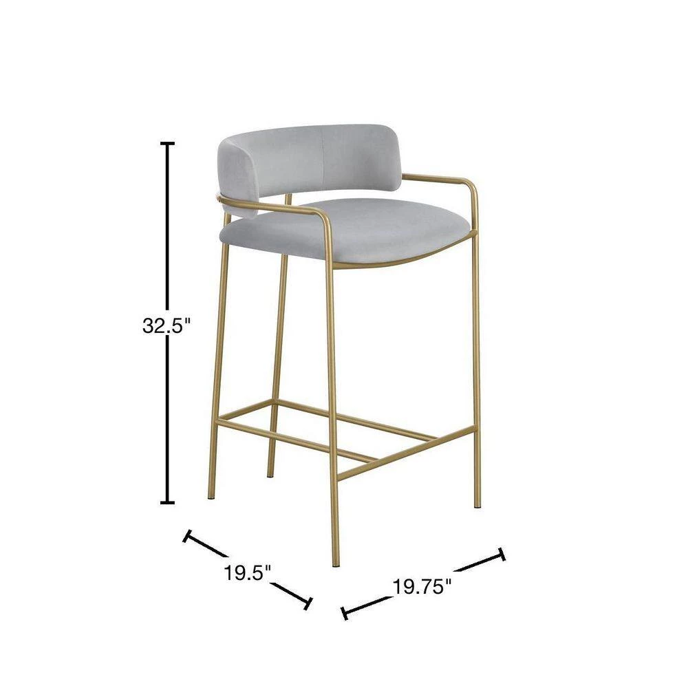 A soft and supple grey velvet envelops the comfy padded seat and linear backrest of this chic and glamorous stool. Situated and supported by a slim rod-like frame in a gold finish, this stool offers an air of sophistication to any bar top or kitchen island. The cool grey upholstery and warm metallic finish contrast, leaving a striking visual to any space. With a retro flair and glam vibe, this elegant stool is perfectly suited for a mid-century style home or contemporary entertainment room. Slide up this stool and relax with a cocktail or glass of wine.