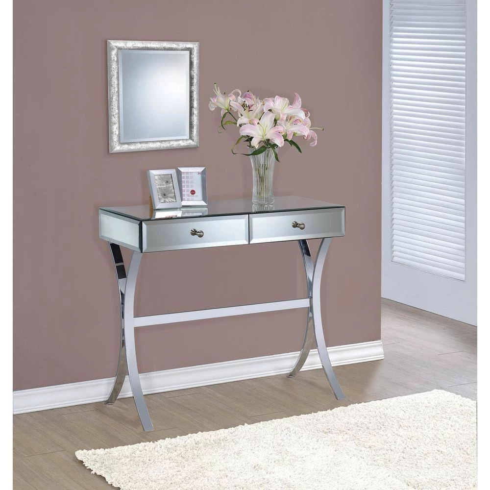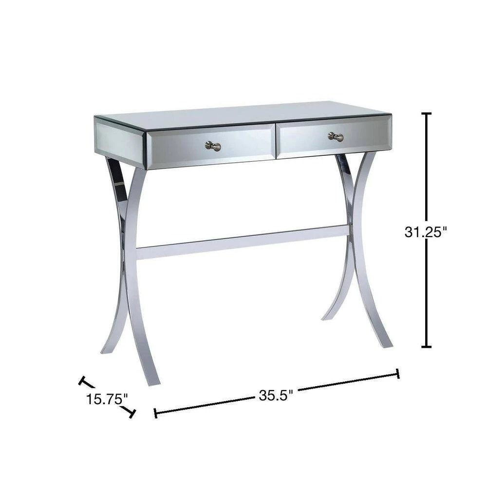 Add this console table to the home for an alluring brilliance and shine. It features two spacious drawers for convenient storage. Wide table top accommodates a decorative table lamp and knickknacks. It features gorgeous curved legs that add a touch of class. Table is beautifully covered in mirror panels with chrome-finished frame and legs for a modern look.
