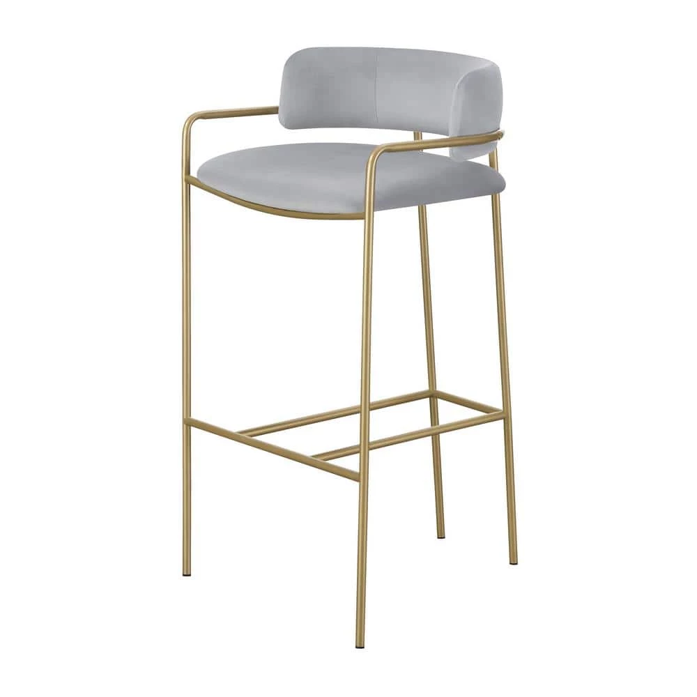 A soft and supple grey velvet envelops the comfy padded seat and linear backrest of this chic and glamorous stool. Situated and supported by a slim rod-like frame in a gold finish, this stool offers an air of sophistication to any bar top or kitchen island. The cool grey upholstery and warm metallic finish contrast, leaving a striking visual to any space. With a retro flair and glam vibe, this elegant stool is perfectly suited for a mid-century style home or contemporary entertainment room. Slide up this stool and relax with a cocktail or glass of wine.