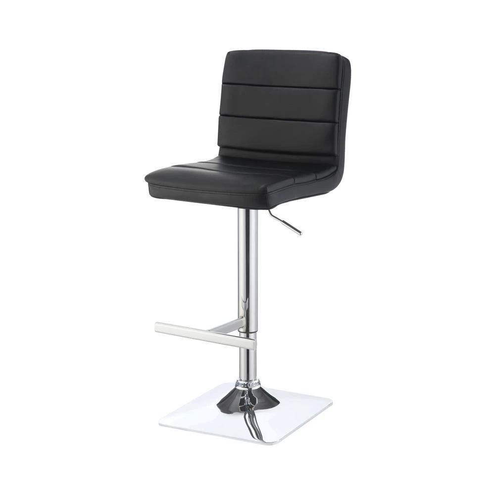 Modern finishes reinforce the contemporary aesthetic of this adjustable barstool. Featuring a height adjustable seat for easy, convenient adjustments to best fit your space. Its seat is upholstered in black leatherette with horizontal stitching that adds depth and detail. A pedestal base features a square foot and a gleaming chrome finish. A T-shaped footrest is built in, offering easy relaxation for a quick bite or a leisurely night cap.