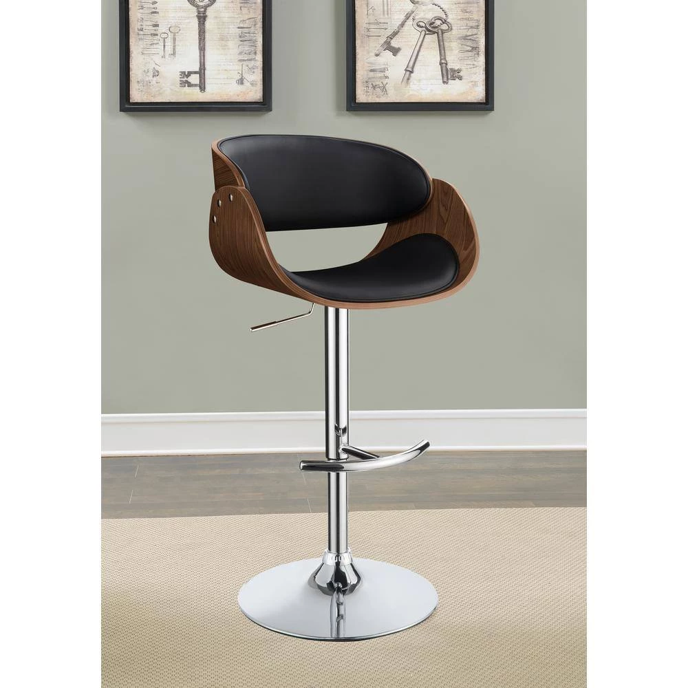 Perfect for a home bar or kitchen island, this barstool is conveniently height adjustable to fit with any space. Beautifully designed, it features a simple, sleek support that flares elegantly into a sturdy, round base. Its seat boasts a cool, curved silhouette with a pleasingly modern feel. The shiny finish of its base creates an appealing contrast to the subdued shades of its seat. With comfortable back and foot rests, it offers maximum support and durability.
