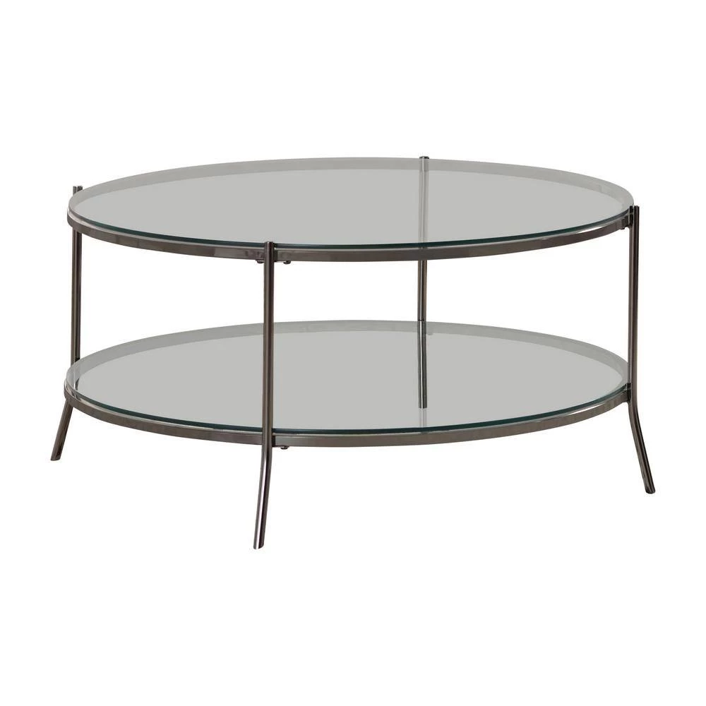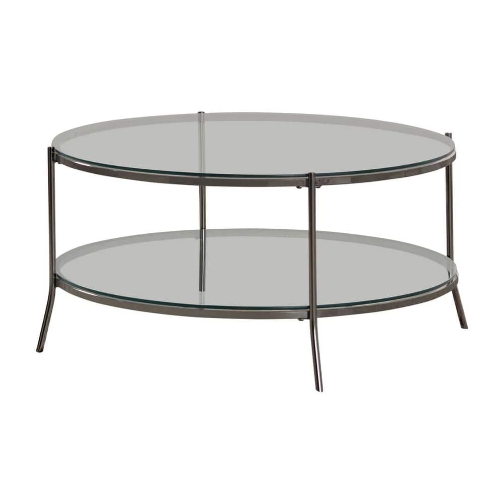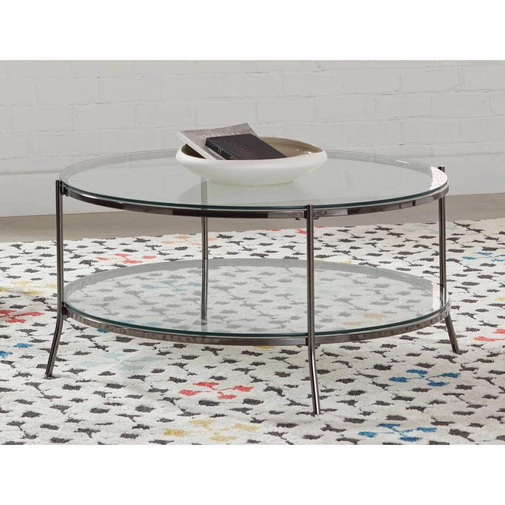 Tie together your seating area with this spacious round coffee table. Perfect for placing in front of a sofa or sectional, this softly rounded coffee table lends a modern touch with its mixed material design and chic style. Topped with a clear tempered glass tabletop and a bottom shelf, this coffee table provides ample space for keeping books and magazines and displaying decor. A slim electroplated metal frame and four leg supports that flare at the foot hold each glass piece in place, and provide a subtly gleaming black nickel finish. Sleek lines and an open and airy design refine any seating area, but work wonderfully in contemporary living rooms and even modern entertainment spaces.
