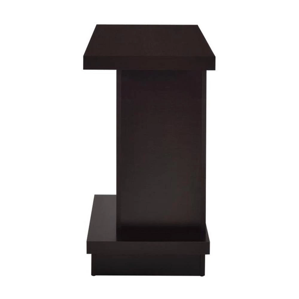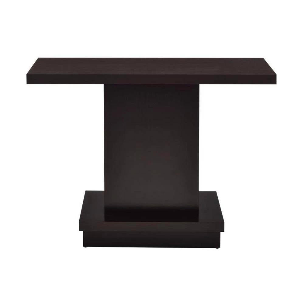 This impressive, sturdy sofa table features straight lines for a timeless appeal. The rectangular table top has space for a lamp and a decorative vase or candles. The wide table stand lends the table a sturdy reliability. The table base is crafted in a pedestal style for a bit of shelf space that accommodates a small houseplant. The warm cappuccino finish adds an inviting ambiance to any living room or den.