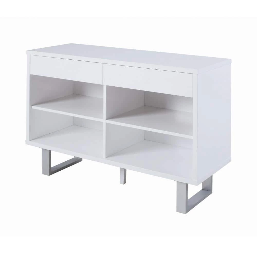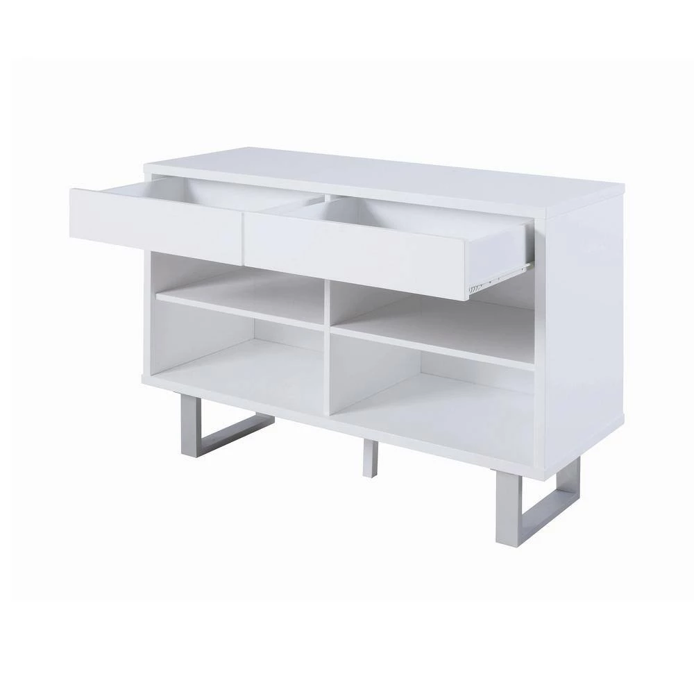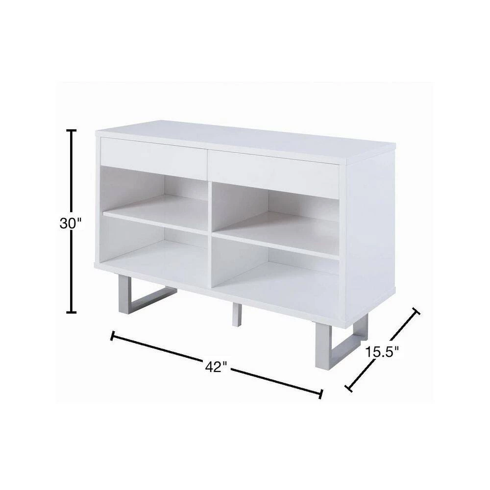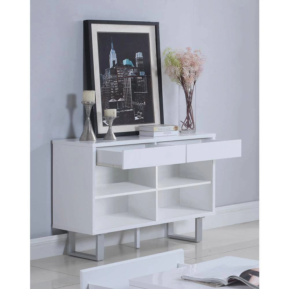 Maintain a sleek, modern feel in any contemporary living room or entryway with this white sofa table. The crisp hue of the high glossy finish creates a clean feel when coupled with the bright metallic legs. Complete with two drawers and four shelves, this table is perfect for storage and display. U-shaped legs complete the open, up-to-date feel of the table. Decorate with your favorite sculpture or print for a personalized touch.