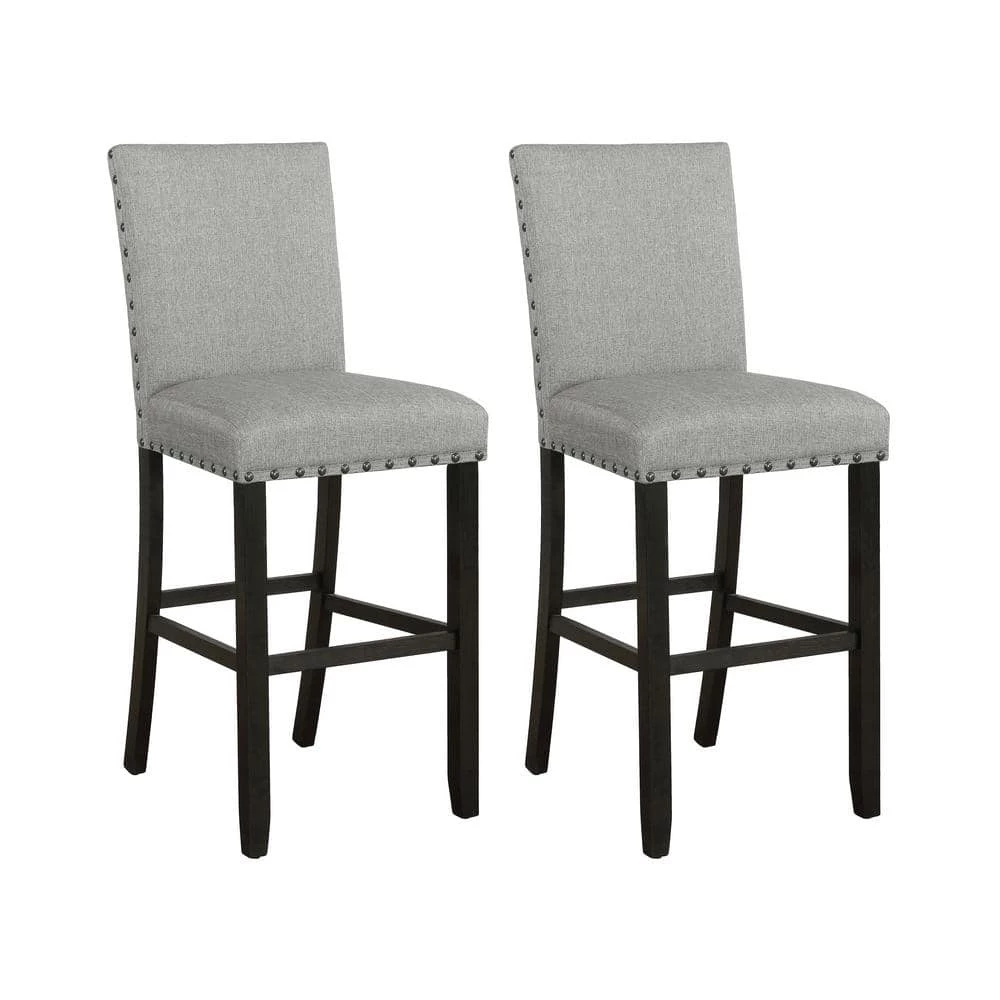 Place these stools next to a kitchen counter for a more rustic, casual look. Each foam-filled upholstered stool is wrapped in a woven linen-like fabric that offers complete comfort. Running along the backrest and seat are hand applied nailhead trims in a dark bronze finish. Constructed of a solid Asian hardwood, each stool offers stability and support, as well as 4 straight, squared legs and foot braces in a dark antique noir finish. Complete your entire dining space with a matching counter height table, available within the same collection.