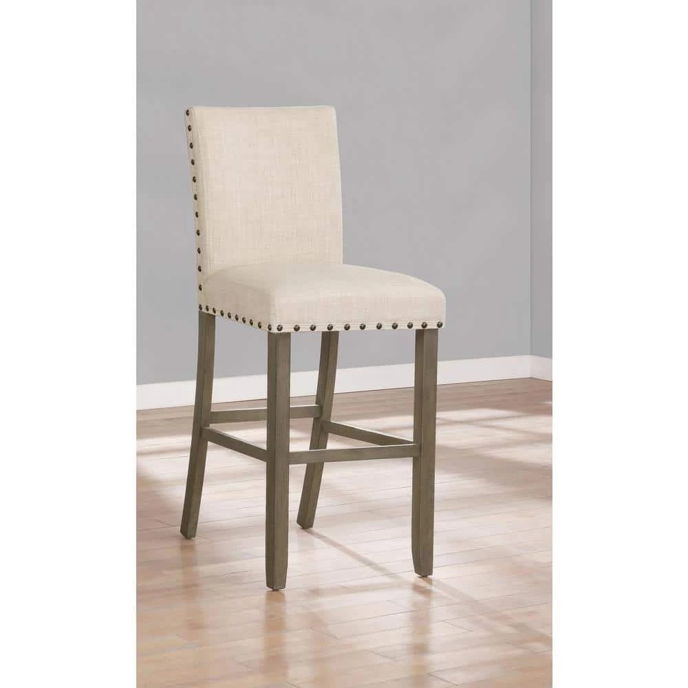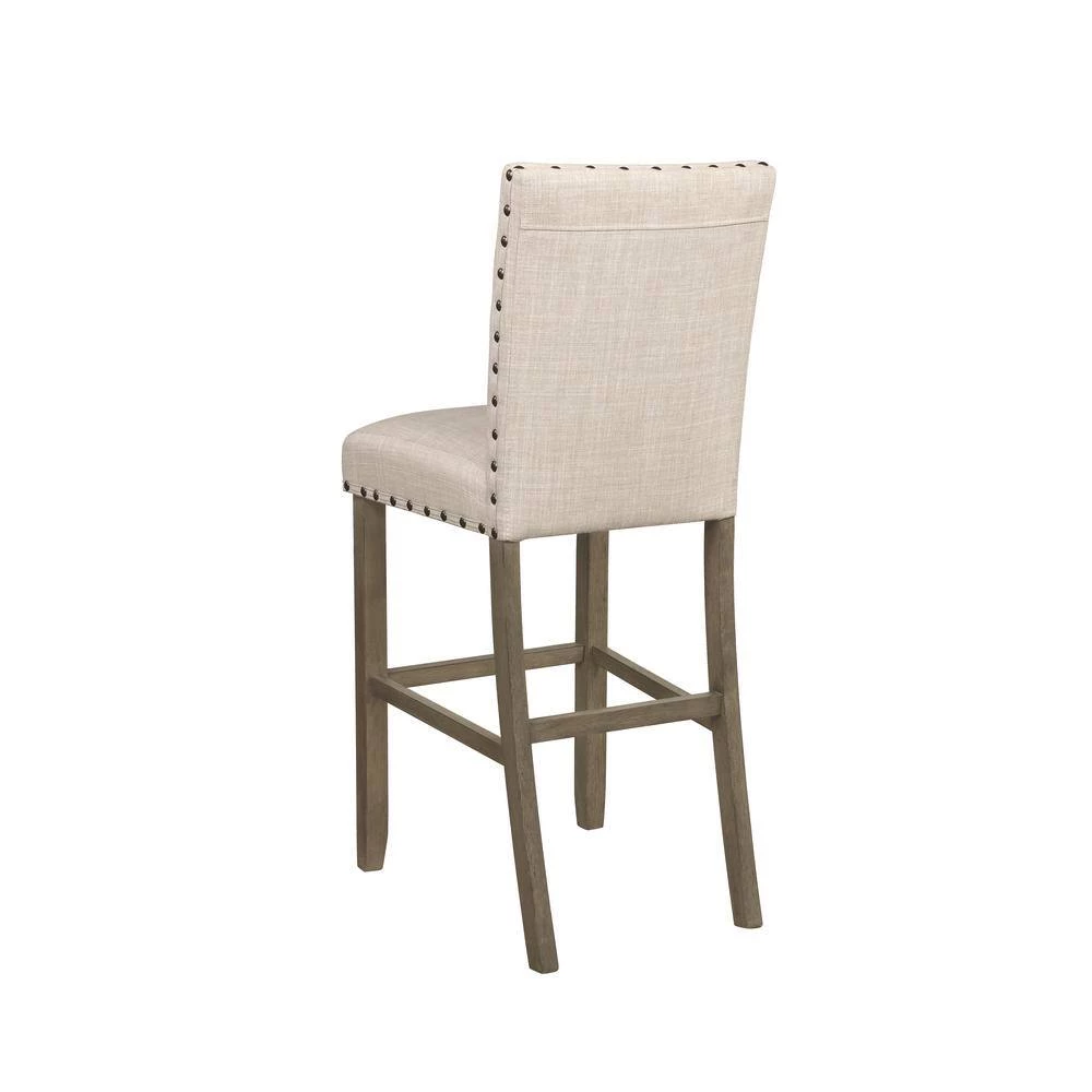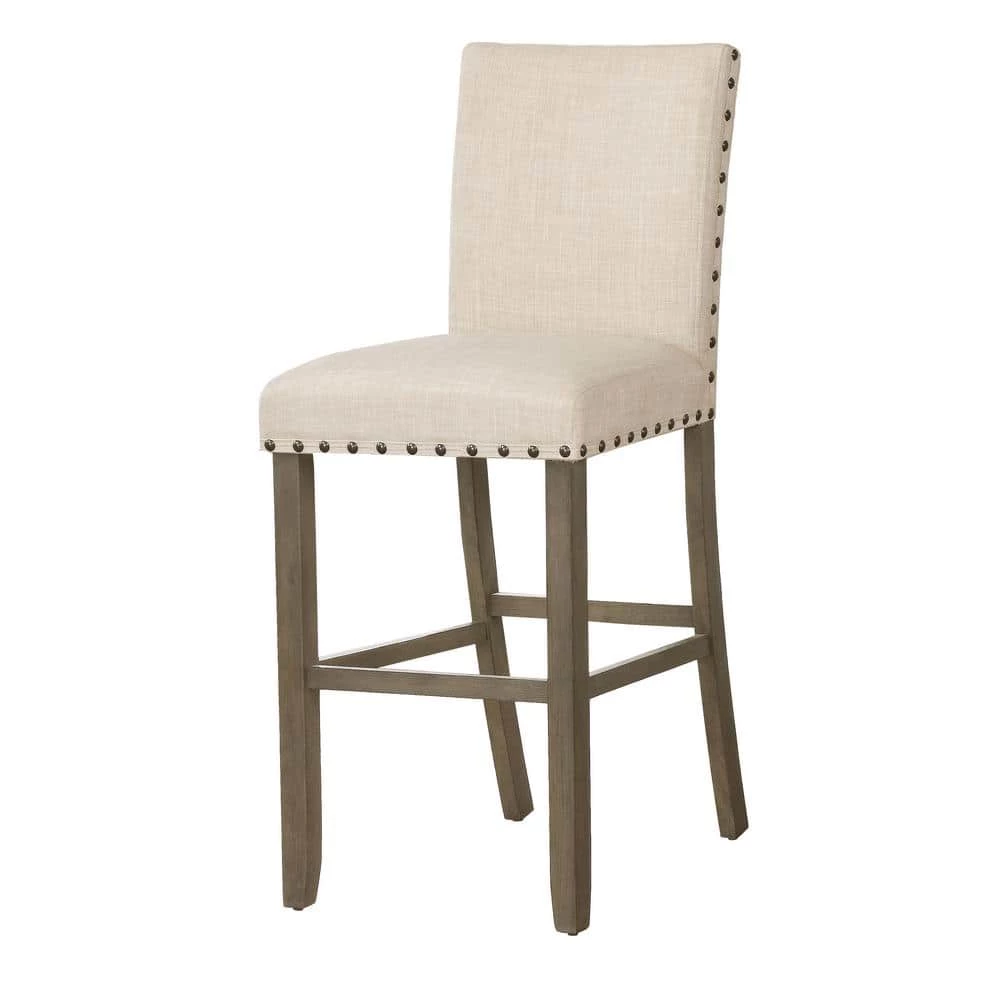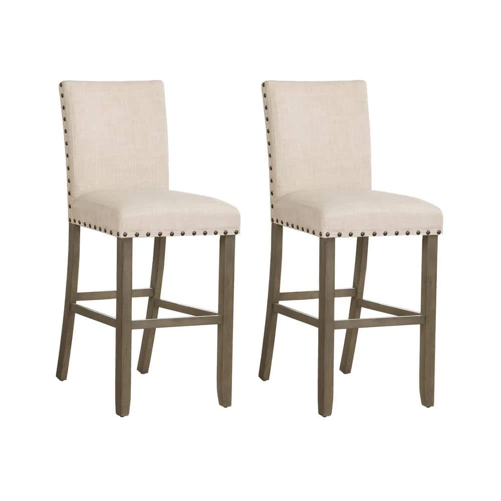 Perfect for adding a traditional touch to a modern farmhouse style home, this set of 2 stools offer a rustic charm. With a solid Asian hardwood frame, each furniture piece offers a cozy upholstered seat with a classic Parson-inspired design. Each seat is also wrapped in soft linen-like fabric. Lining the edges of each chair is an individual nailhead trim in a dark bronze finish, which adds a handmade industrial touch. Tall back seats extend into 4 straight and squared legs that offer a subtle tapering and a neutral rustic brown finish.