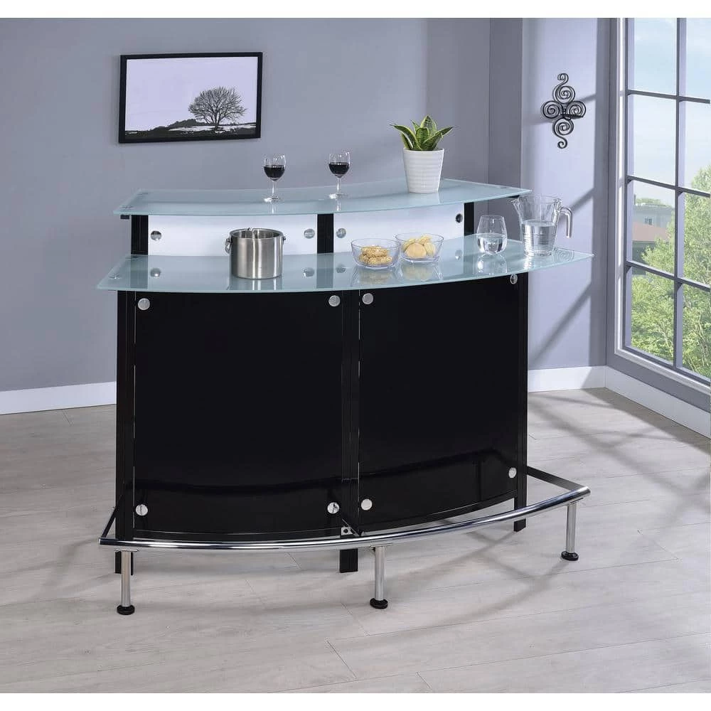 Bring your next cocktail party to life with a stunning statement of glamour. This marvelously modern chrome bar unit lets you show off your mixology skills in style. Place contemporary bar stools of your choice in front of its metal foot rest to give your guests a comfy front row seat as you lavish them with tasty libations. 2 separate glass tops provide plenty of space to mix and serve. With striking panels of black and white acrylic and a pleasingly curved silhouette, this charming bar unit looks fabulous in an elegant parlor or lounge.