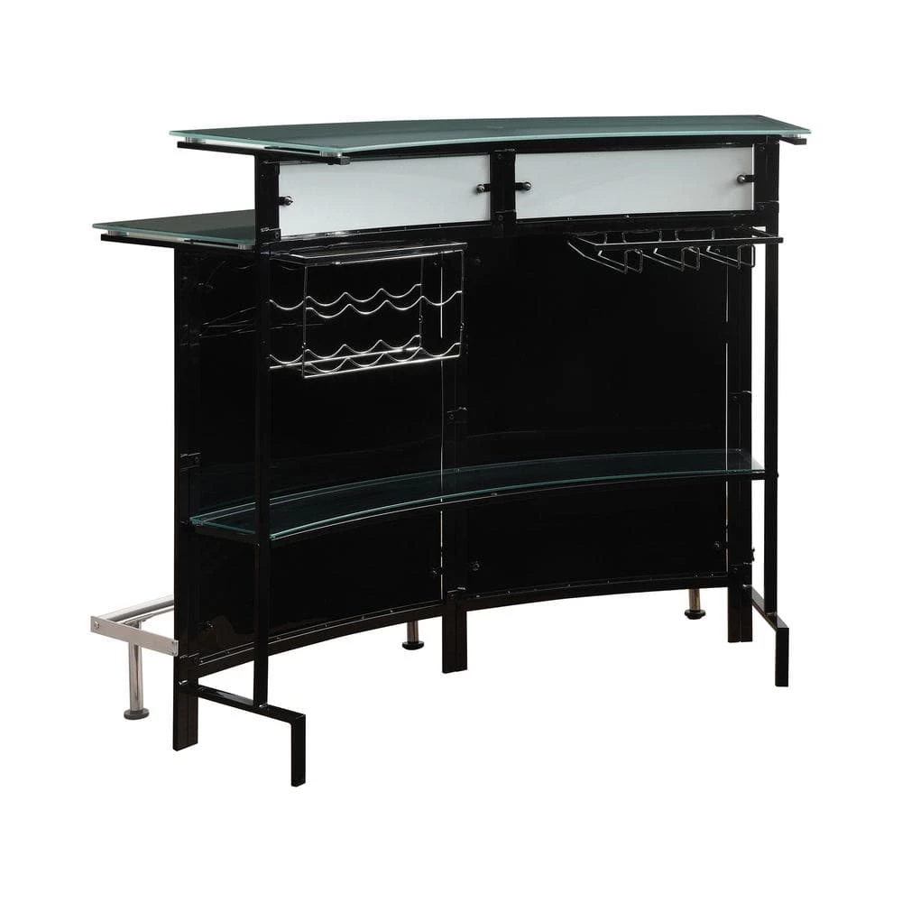 - Contemporary bar unit in black finish with electroplated chrome footrest