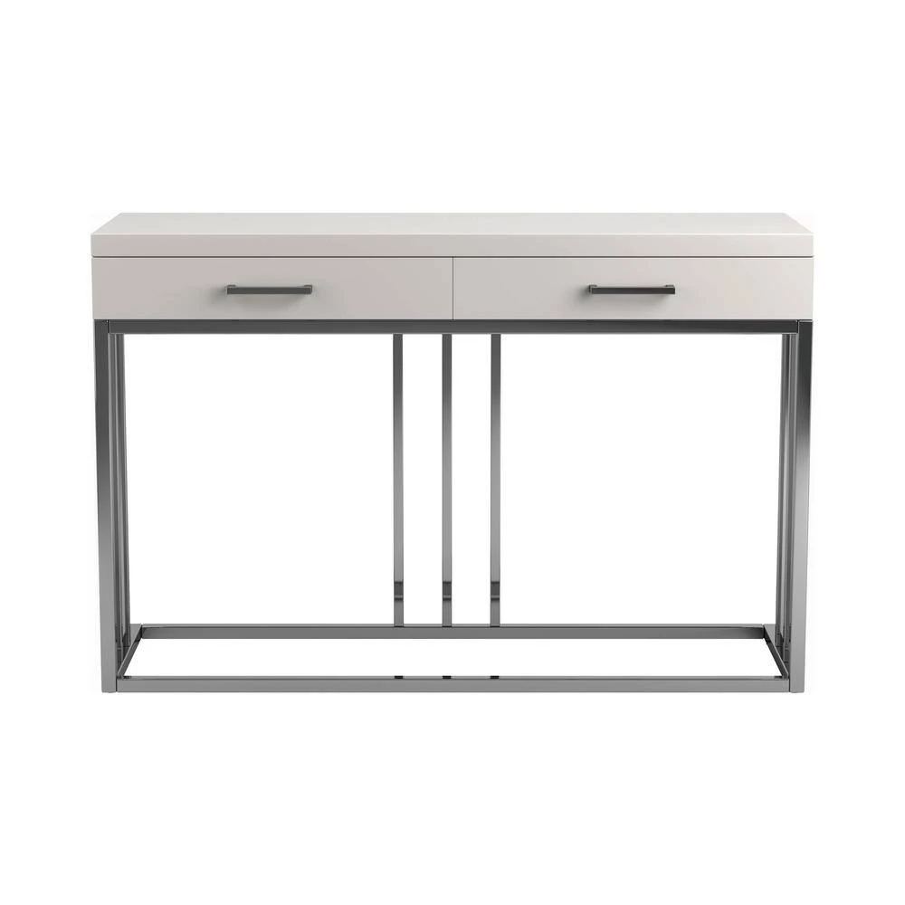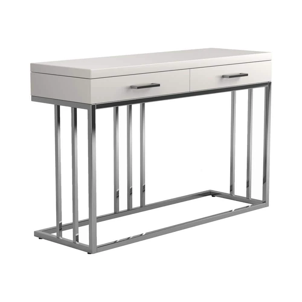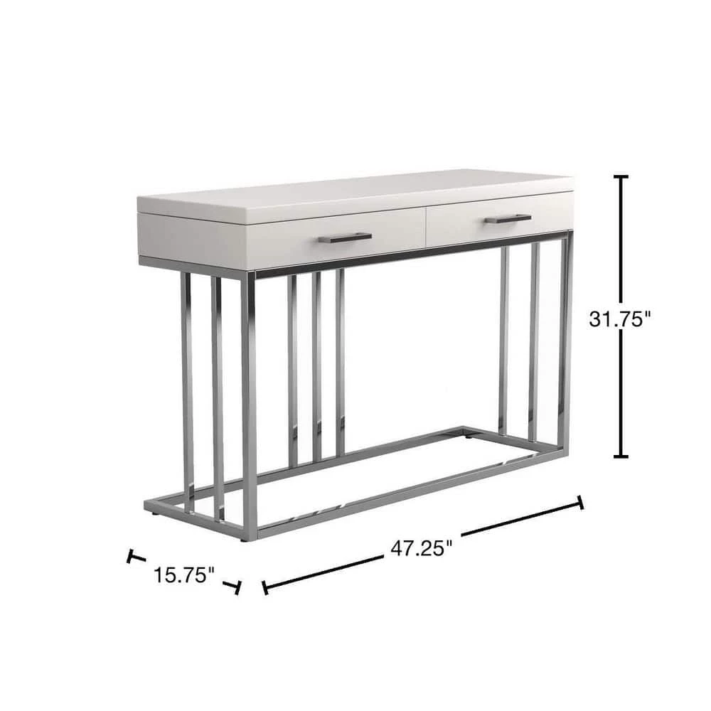 Celebrate the modern lifestyle with this sofa table. It brings you another piece to show your love for contemporary design. Whether you place this sofa table behind your sofa or against the wall, the glossy white tabletop and metal base combines to present your style in a classy manner. Drawers float open and shut on full extension glides. Harmonizes well with matching coffee table and end table.