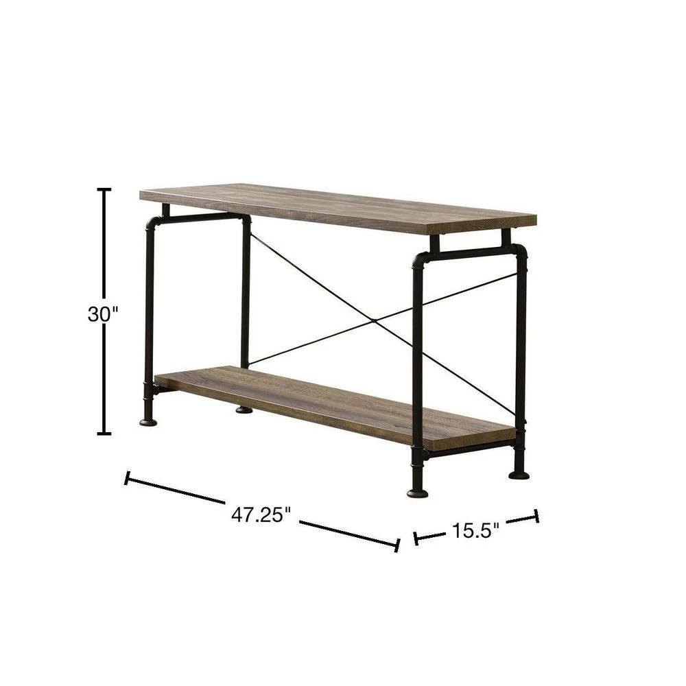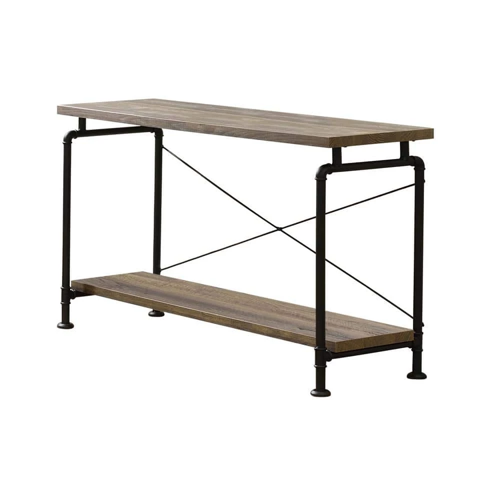 Enticingly industrial, this sofa table completes the appearance of your living space. Its expansive tabletop is finished in an eye-catching rustic oak. The black pipe-inspired trim provides a wonderful contrast to the tabletop. Lower shelves are available to store items or display decor. This piece is durably constructed from metal for years of enjoyment.
