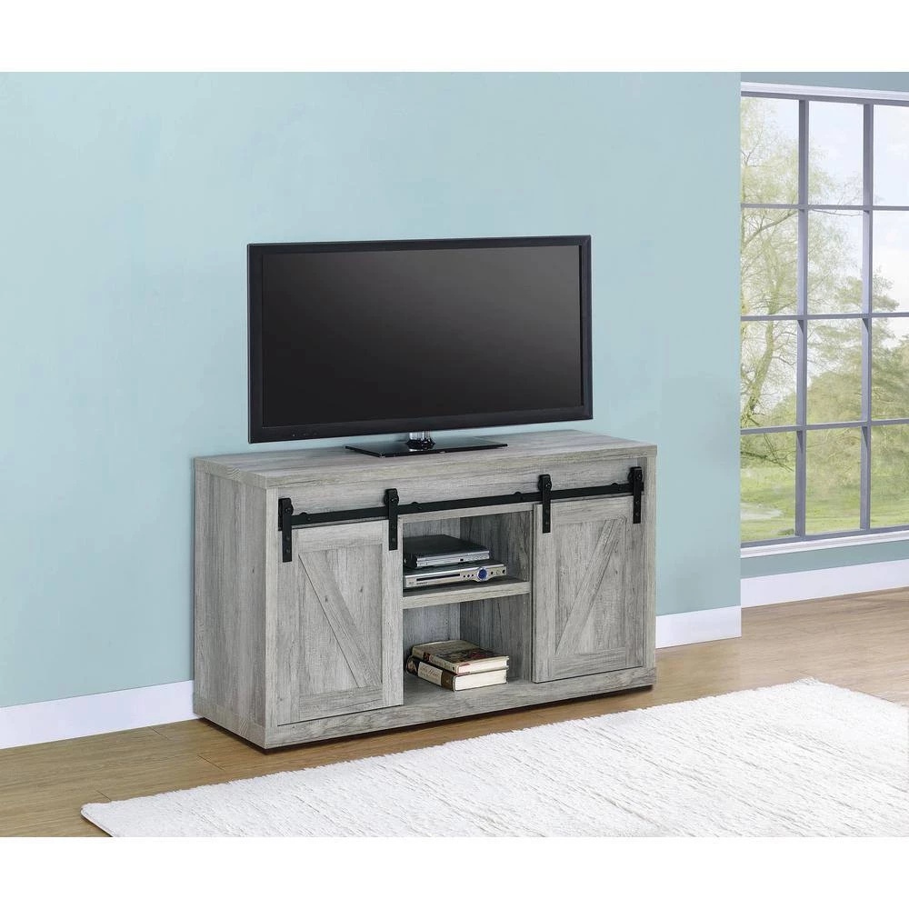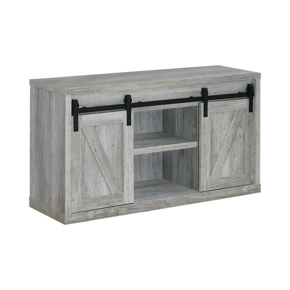 Whether you place it in a rural farmhouse, or downtown penthouse, this TV console is sure to be a hit. Clean lines give a nod to modern style. The distressed look definitively boasts of the rustic nature of this piece. Dream of life on the farm with two (2) sliding barn doors. Complement your space with your choice of colors and sizes.