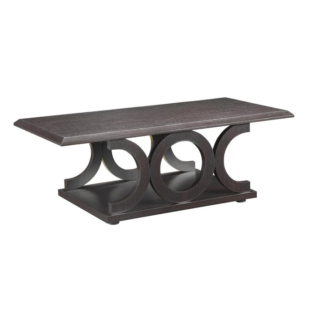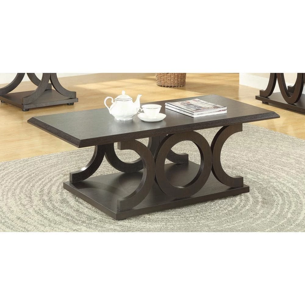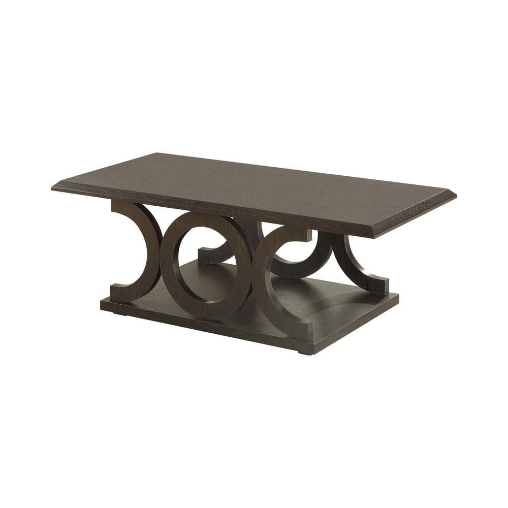 This handsome coffee table exudes charm, character, and class. Elegant, C-shaped curves flow gracefully together to create the eye-catching design of its support. A finish of rich cappuccino adds warmth and depth. A convenient, open-bottom lower shelf provides additional storage. This table is complete with a smooth, sturdy, rectangular top, enhanced by an appealing hint of polish.