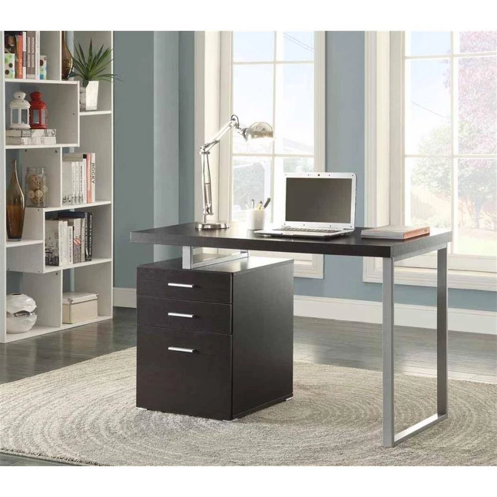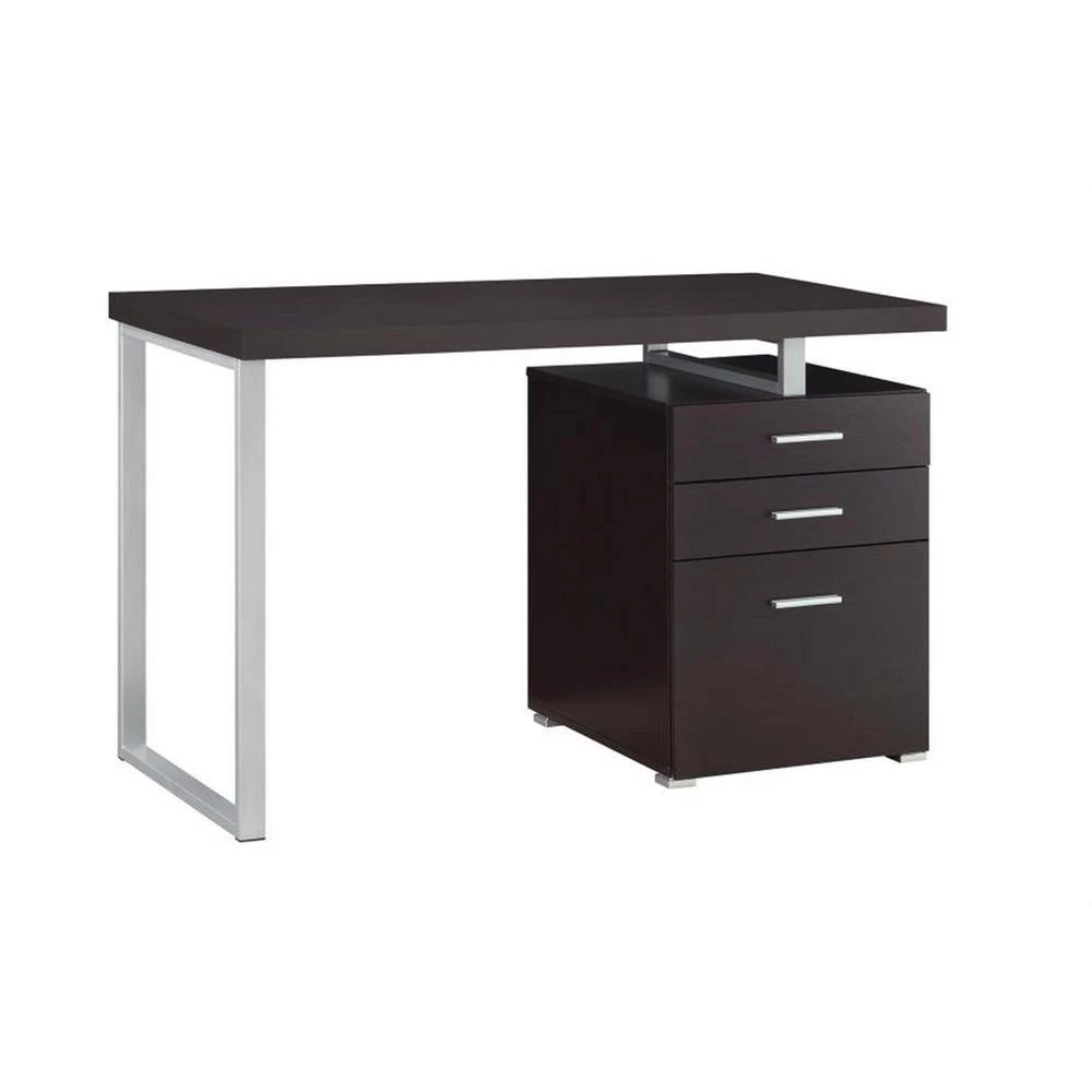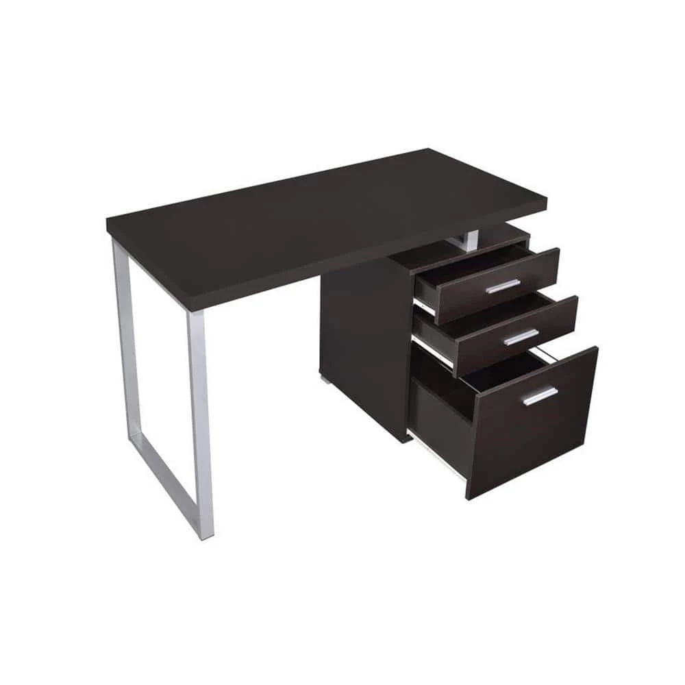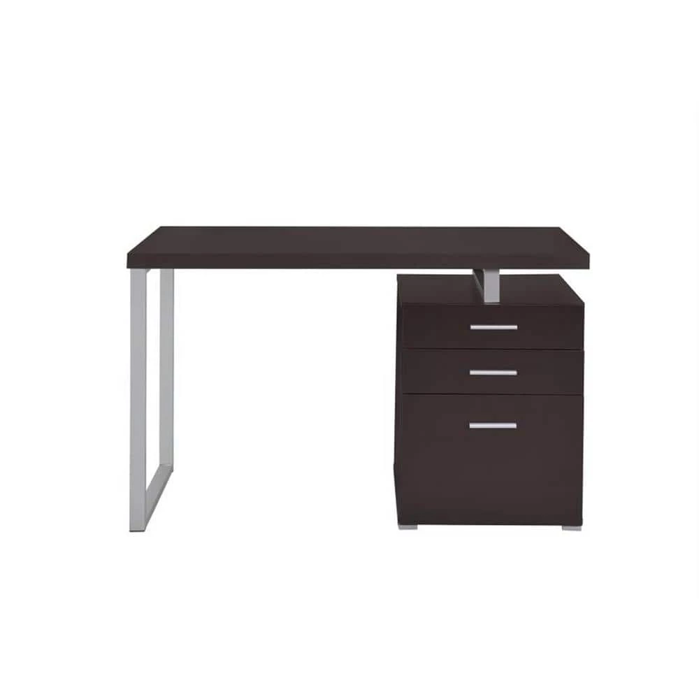 This office desk is an excellent option for those who like to stay neat and organized. Its three spacious drawers include a filing cabinet to safely store both legal and letter sized files. Constructed from steel and other durable materials, it boasts a large surface for working, studying, or catching up on social media. Its lovely finish of deep cappuccino elegantly offsets its sleek, silver frame, for a contemporary look that’s thoroughly appealing. This desk is also available in white and weathered gray for even more attractive options.