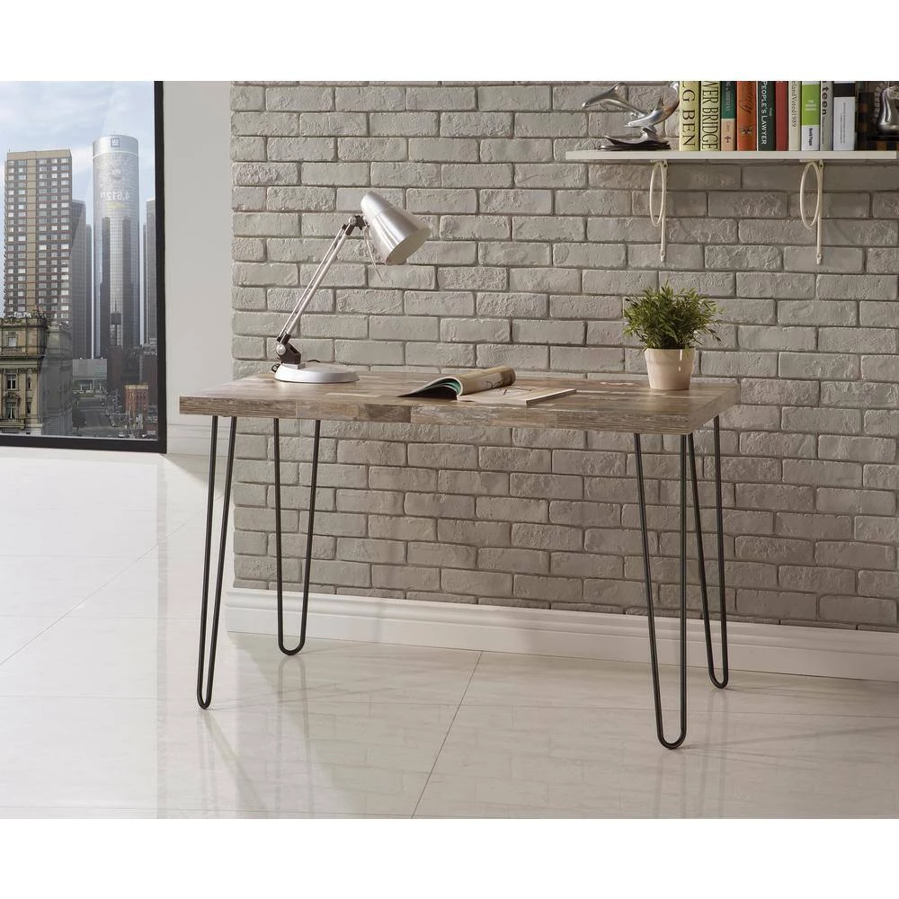 Celebrate a fun minimalist look with mid-century modern styling. With a touch of farmhouse charm, this writing desk keeps it simple yet stylish. Salvaged cabin creates a nature-influenced finish for a straight desk top. Metal hairpin legs with a bold black finish offer a perfect contrast. Make this desk work in a casual home office or kitchen space.