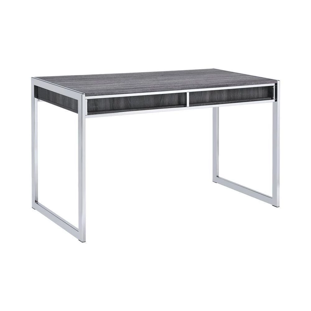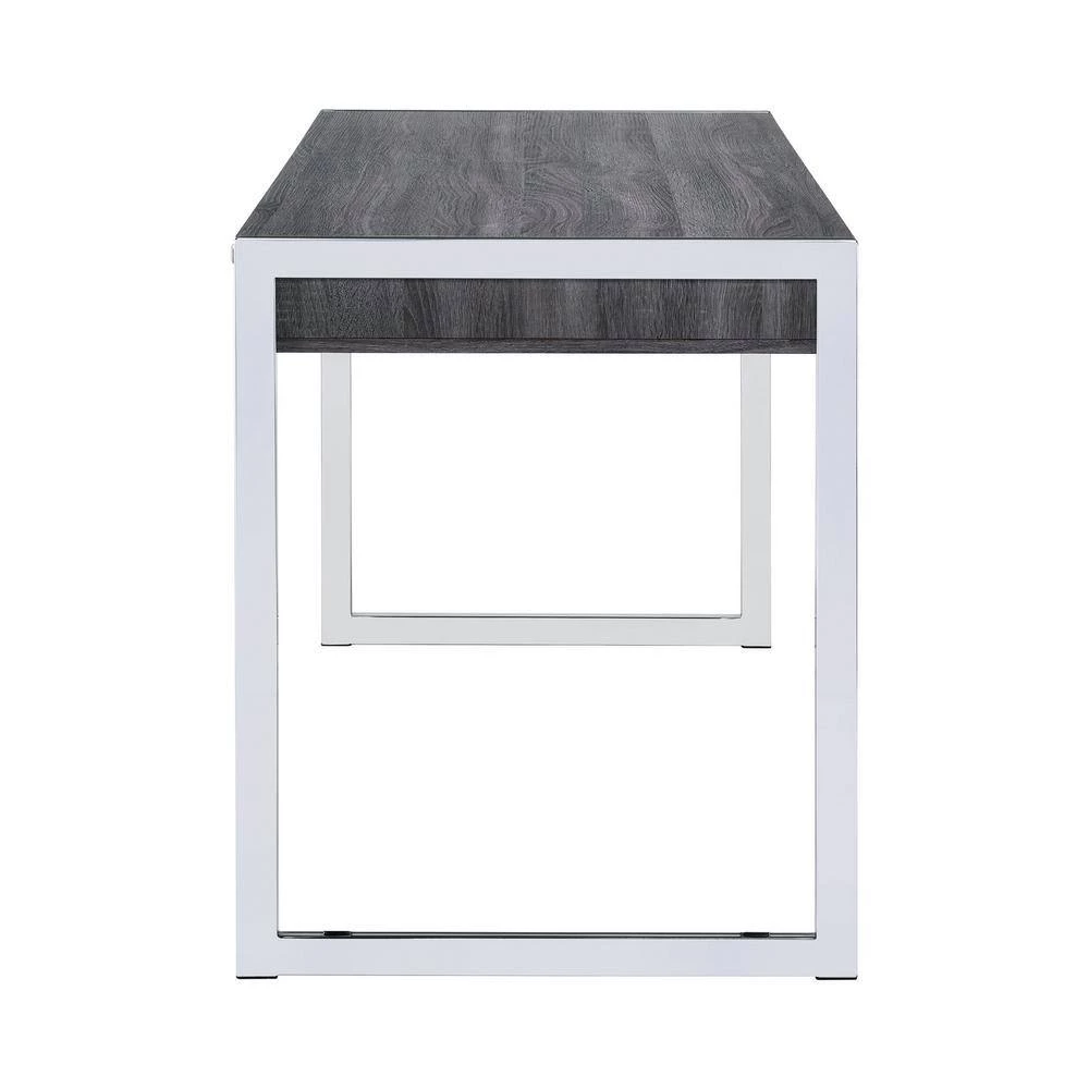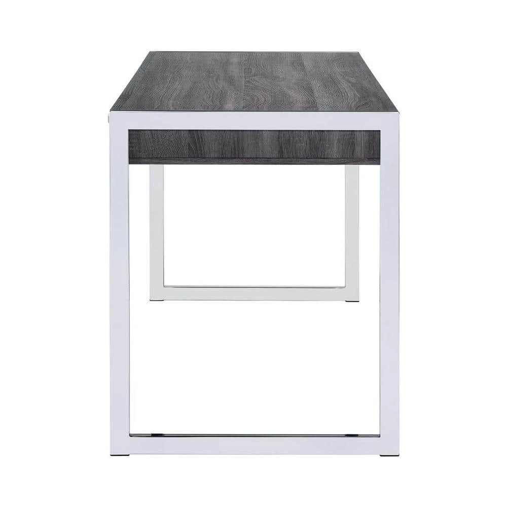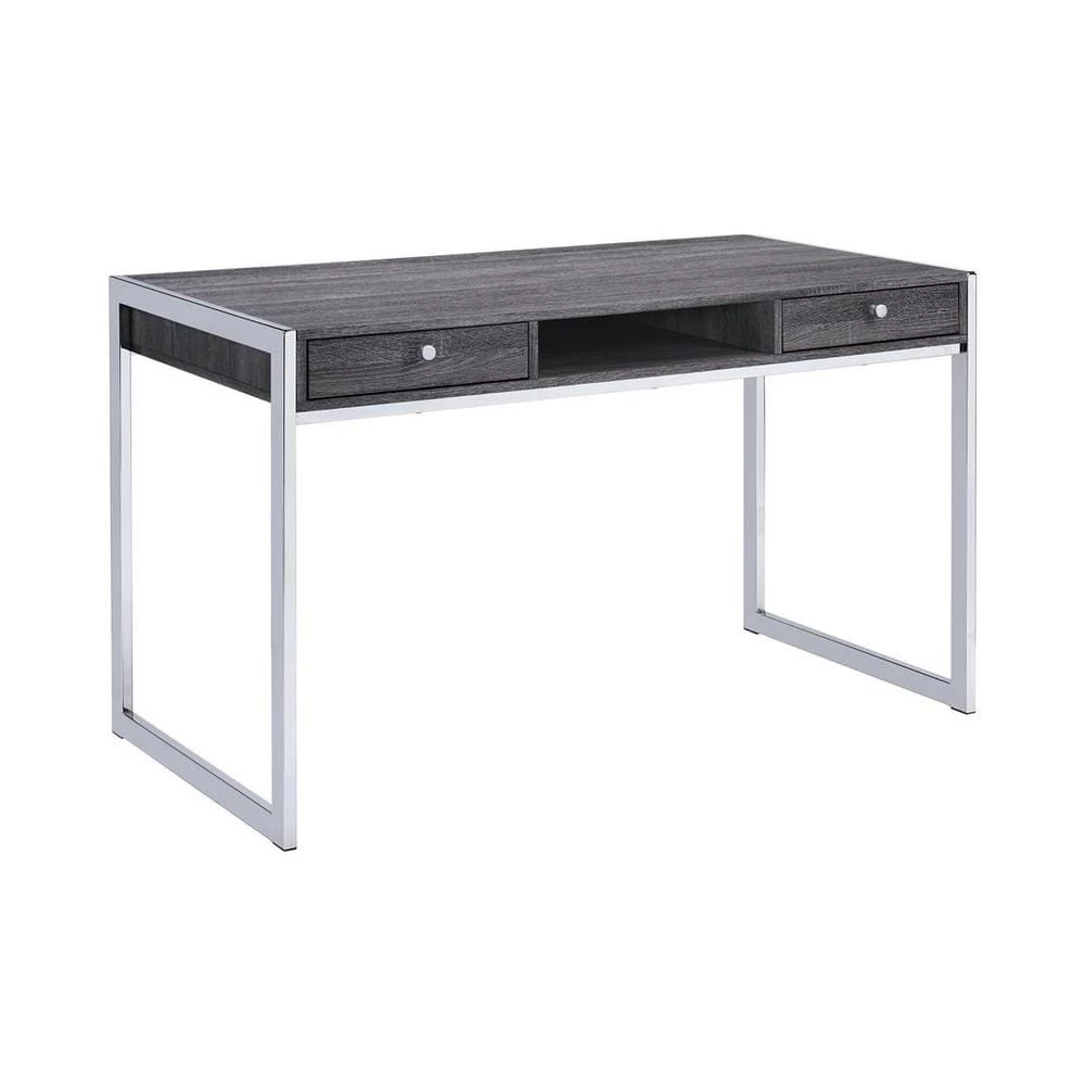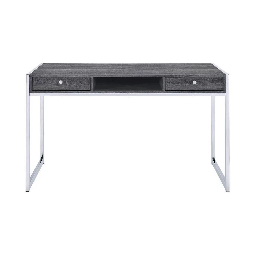 Built with just the basics, this writing desk delivers cool, stylish sophistication. Minimalist design elements add a refreshing touch for a space that gravitates toward modern. With a weathered grey finish desk unit, it brings a cool, neutral palette. Take advantage of an open center compartment between two drawers with full extension glides. Steel square frames on each side offer a balanced look.