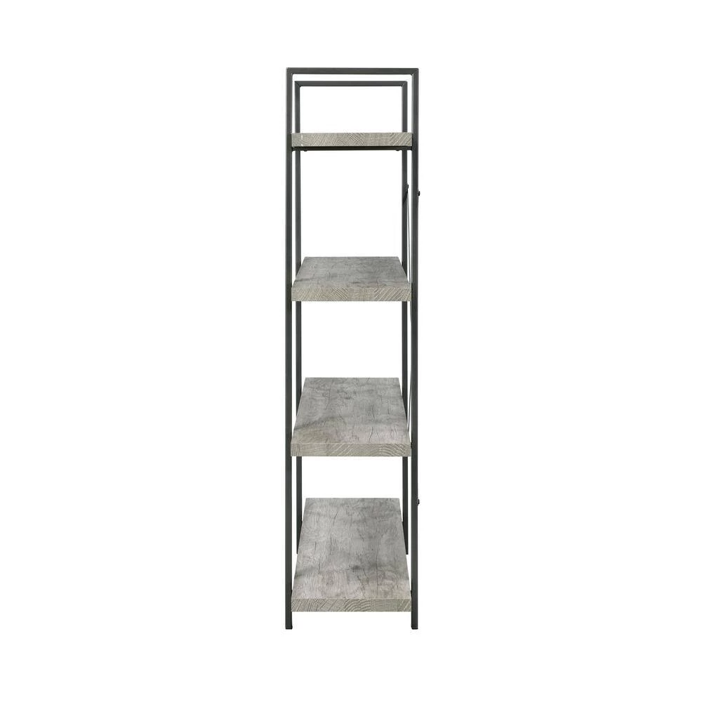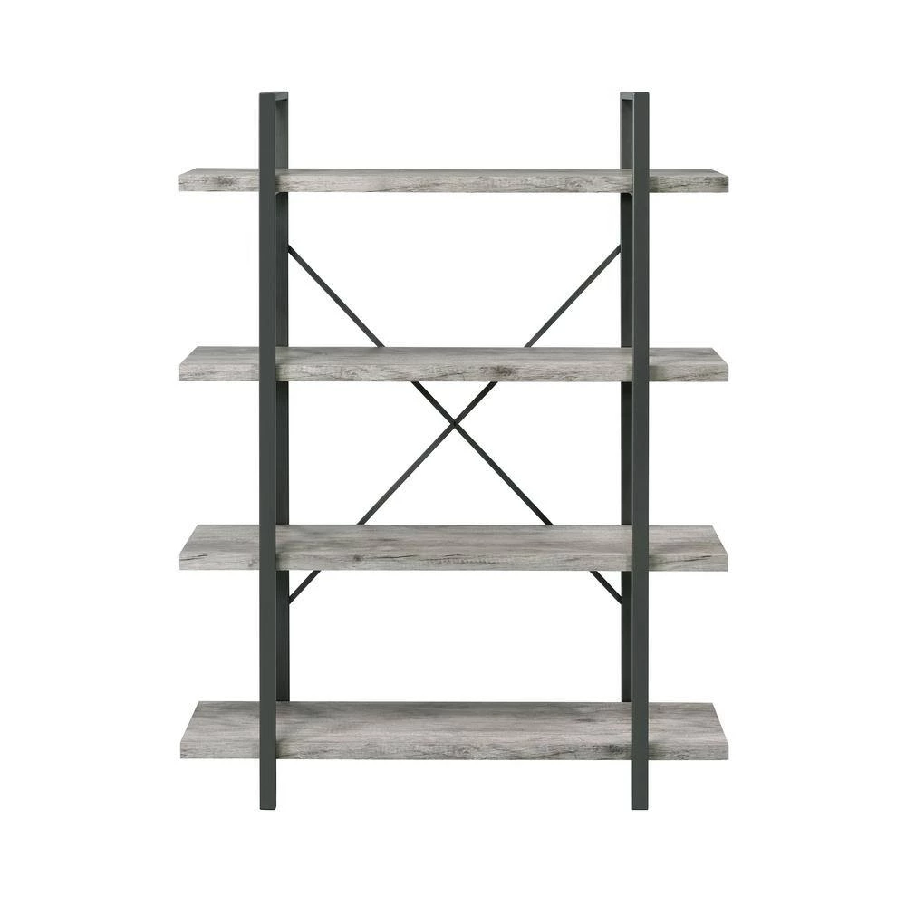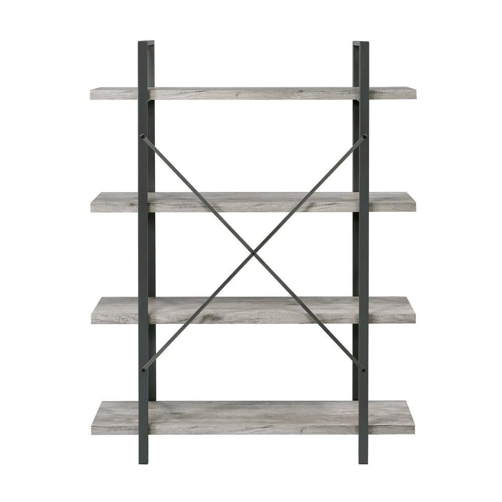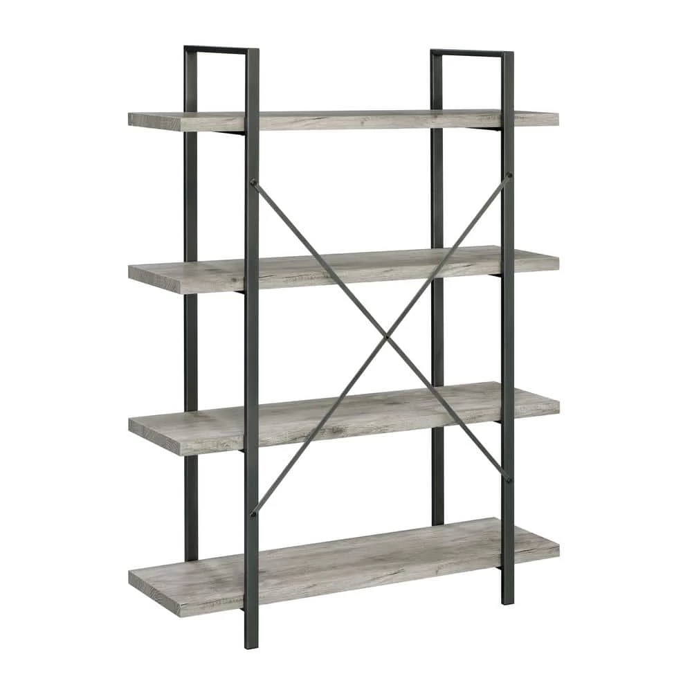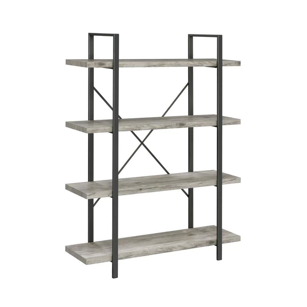 This perfectly rustic style bookcase will soon improve your living area or workspace. Four spacious shelves provide plenty of storage for your book collection. The durable geometric frame provides an open and airy display. The cross back design provides additional support and aesthetic flair. This four-shelf bookcase is constructed from materials such as steel and engineered veneer.