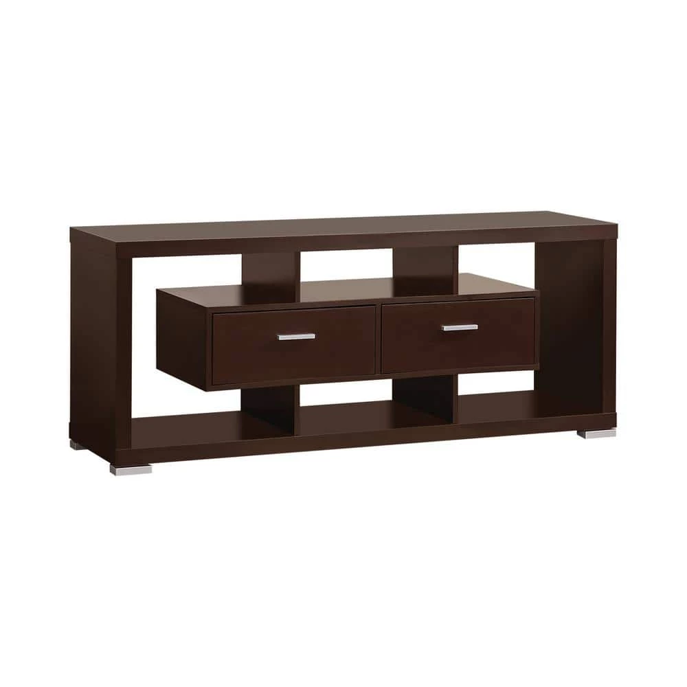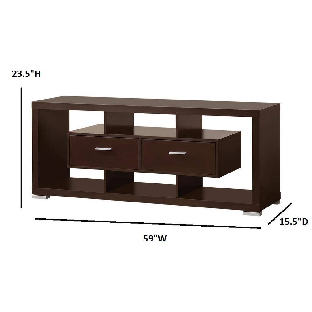 Elevate a living room with the rich hue of this modern TV console. In a cappuccino finish, the straight lines and angles are enhanced. Two large storage drawers are centered around open shelves. Complete with contrasting metallic hardware, the drawers are great for storing remotes and electronics. Display your favorite sculptures or movies on the shelves.