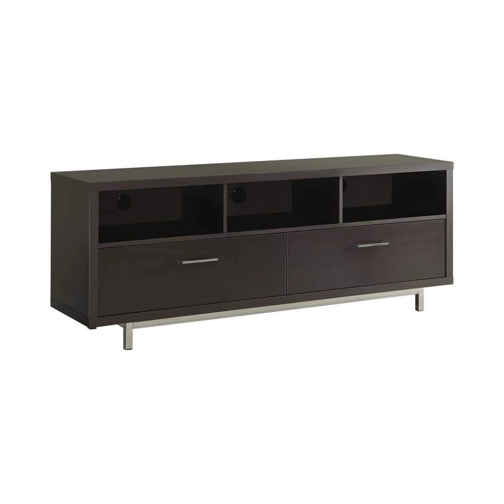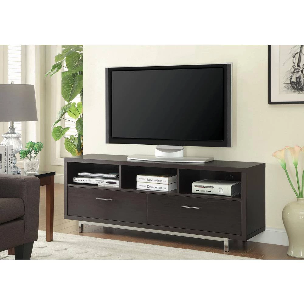 Update your space with glamour and grace. This TV console has a bold, stylish appearance that enhances any living room. A brushed silver frame and high-shine chrome hardware add a posh, polished accent to its strong silhouette. Its large storage area includes two large drawers and three open compartments, while top-quality craftsmanship keeps valuables safe and secure. This gorgeous console is available in your choice of white or cappuccino finishes, offering two attractive options to accentuate your personal style.