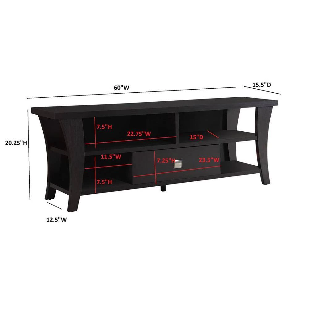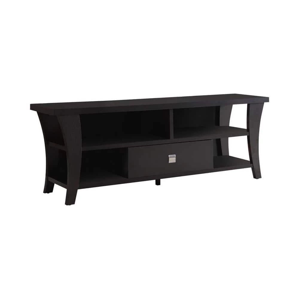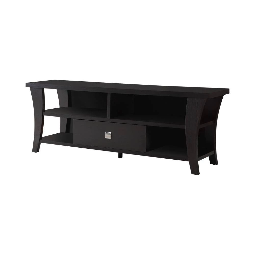 Mix up the ambiance of a transitional space. Perfect for a flat-screen TV, this cappuccino finish television console shows off upgraded design elements. Sleek tapered legs create a sensual silhouette. Open shelving and a single-drawer offer visible and hidden storage for media and essentials. Metal hardware adds an ornate finishing touch.