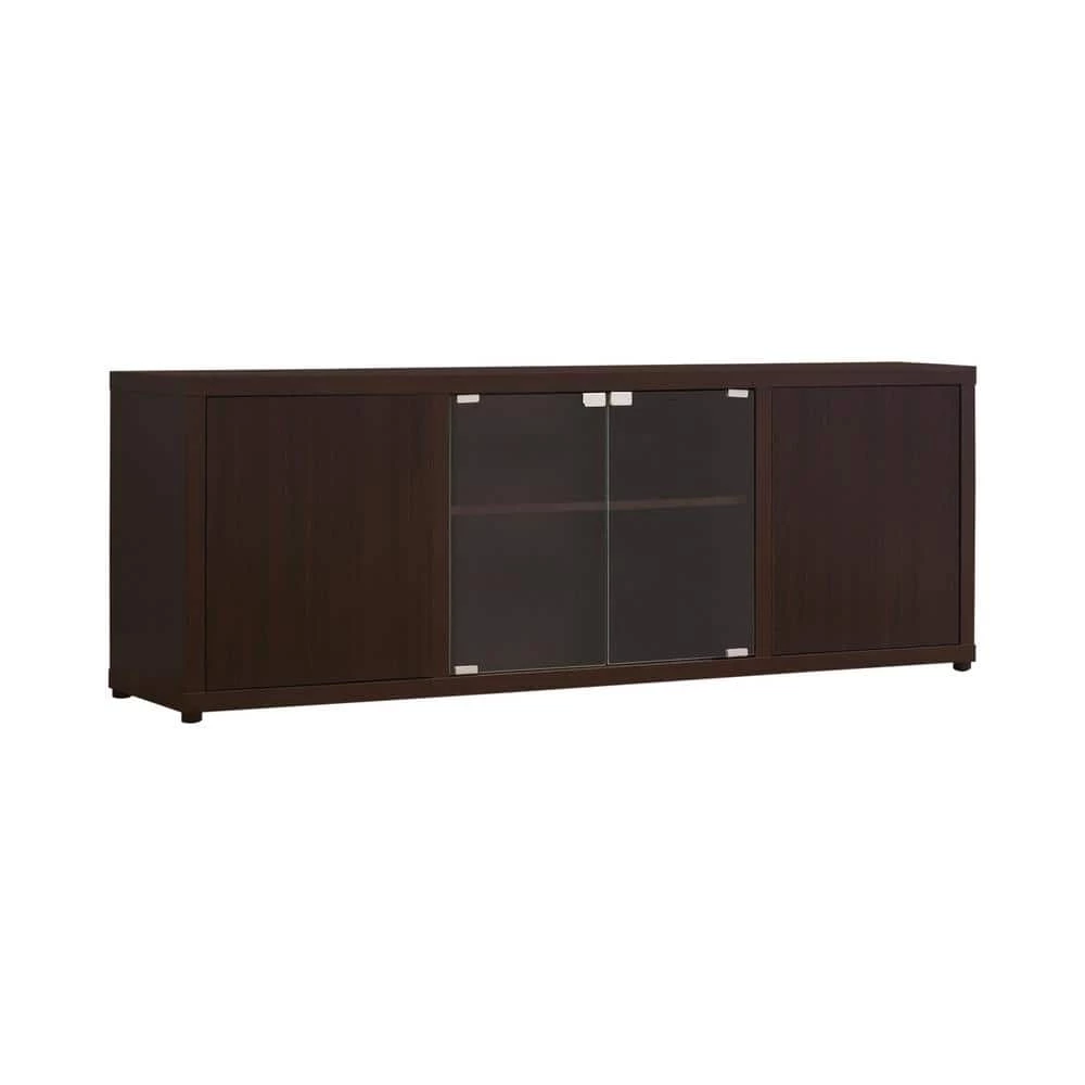Expertly crafted, this TV console is perfect for casual home entertainment. It provides ample storage space to keep all your essentials in one place. Its simple silhouette is accentuated by a deep cappuccino finish and eye-catching silver embellishments. Push-to-open glass doors add a pleasing touch of convenience. Crafted from materials of the highest quality, this console exudes strength and durability.