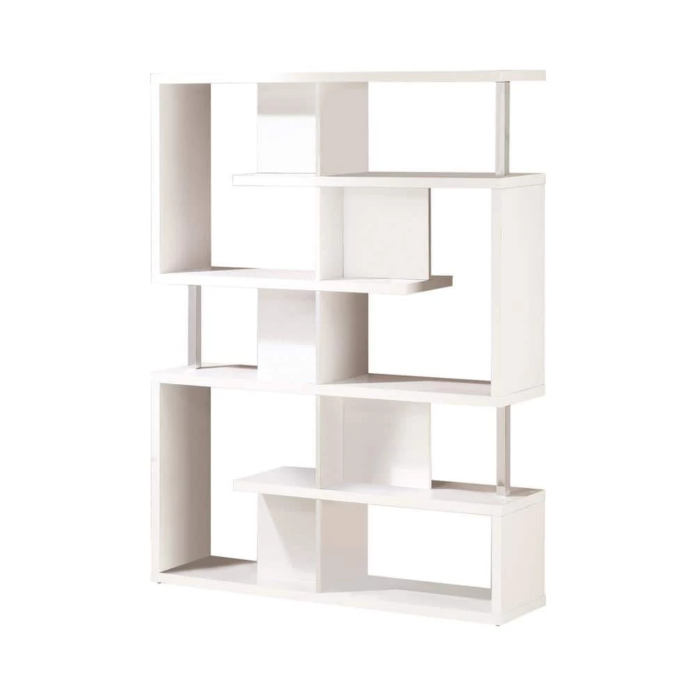 Add an artsy element to a library, living room, or home office. This five-tier double bookcase makes a bold statement with its funky, modern silhouette. Its shelves are arranged in a striking, geometric design for an updated look. This bookcase is crafted from steel, particle board, and engineered veneer for sturdy durability. Whether you choose a black or white finish, its gleaming chrome details pull it together in style.