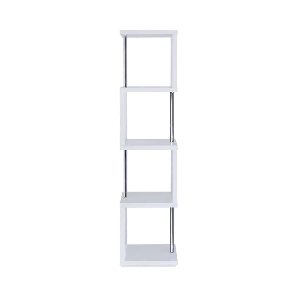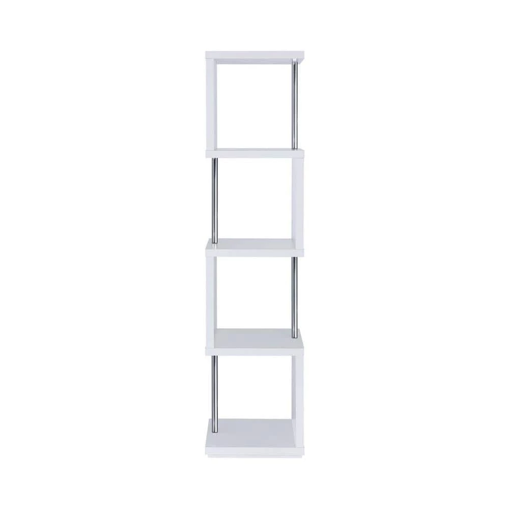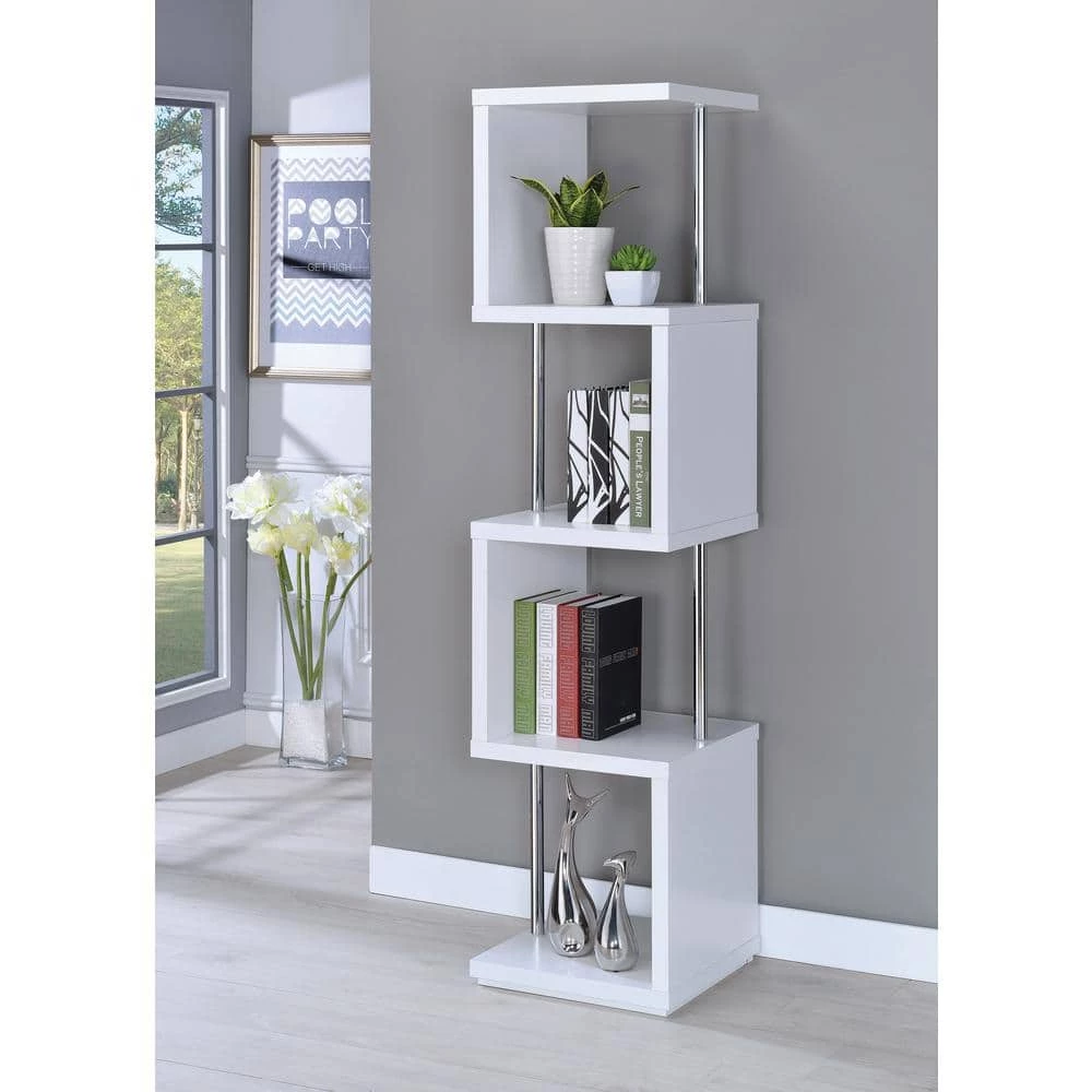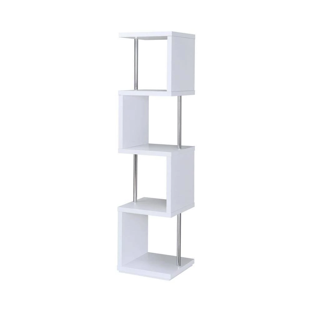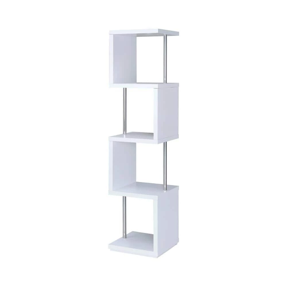Go with the flow in a modern space with an edgy, artistic look. This four-tier bookcase is a great option for a compact space. Enjoy a modular, geometric silhouette and a choice of finishes. Steel supports reinforce shelving that hosts books and decor. Choose from finishes that intensify the attitude of your custom space.