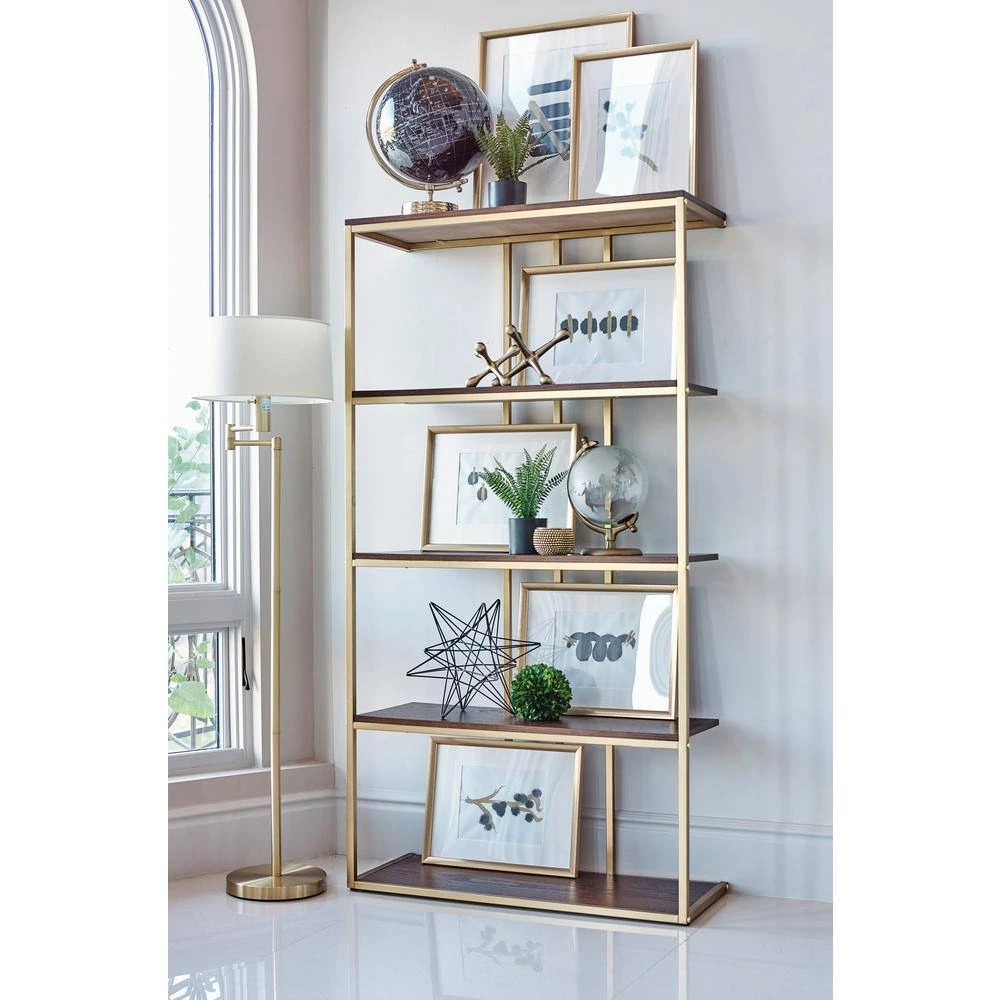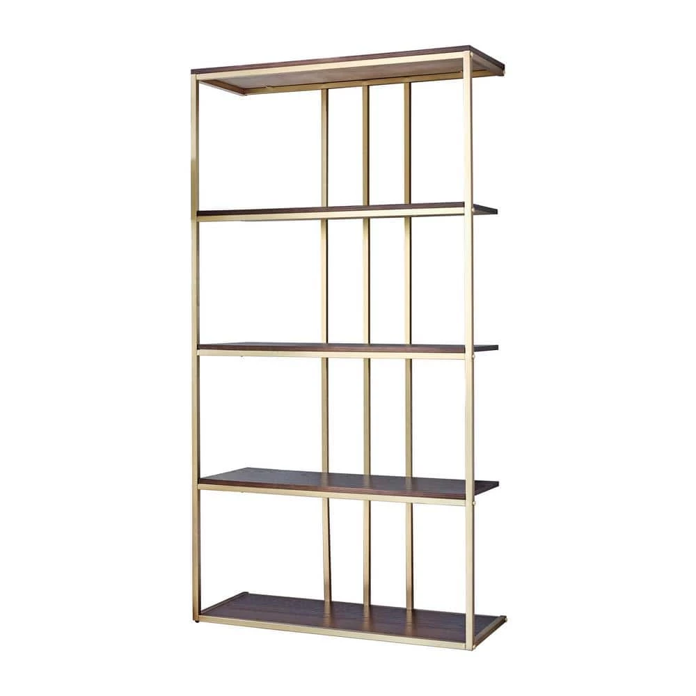 Beautifully crafted with sleek, slim lines, this contemporary bookcase will take your decor to a new level of style. The metal frame is electroplated in matte brass for a lavish, luxurious look. Four spacious tiers of shelving create a beautiful setting for decorative display. Oak veneered shelves in a cherry finish for superior sturdiness and stability for superior sturdiness and stability. Wherever you choose to place it, this exquisite design gives any room a look of modern elegance.