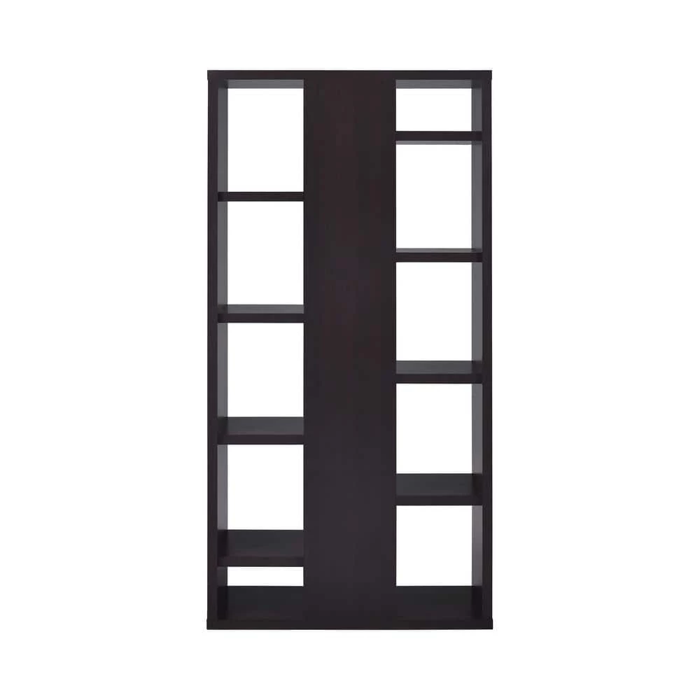Integrated shelving blends style with substance, making this bookcase a tremendous find. Linear design elements stagger to create a fresh, fun silhouette. With a cool cappuccino finish, it blends beautifully with a number of palettes. Increase storage and display options in a contemporary room with this tasteful piece. Display books, art, decor and even potted greenery.