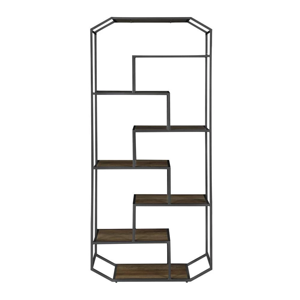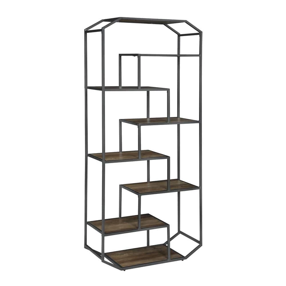 Your dreams of a stylish living area or library come to life with this rustic brown bookcase. Various tiered shelving units create a geometric display. Proudly place your decor items and books on the shelves for an interesting aesthetic appeal. The frame is crafted from durable metal that contrasts with the wood shelving units. Crafted from steel, practical board, and veneer.