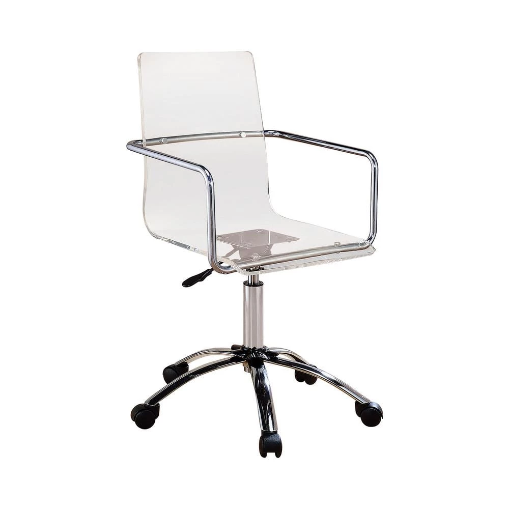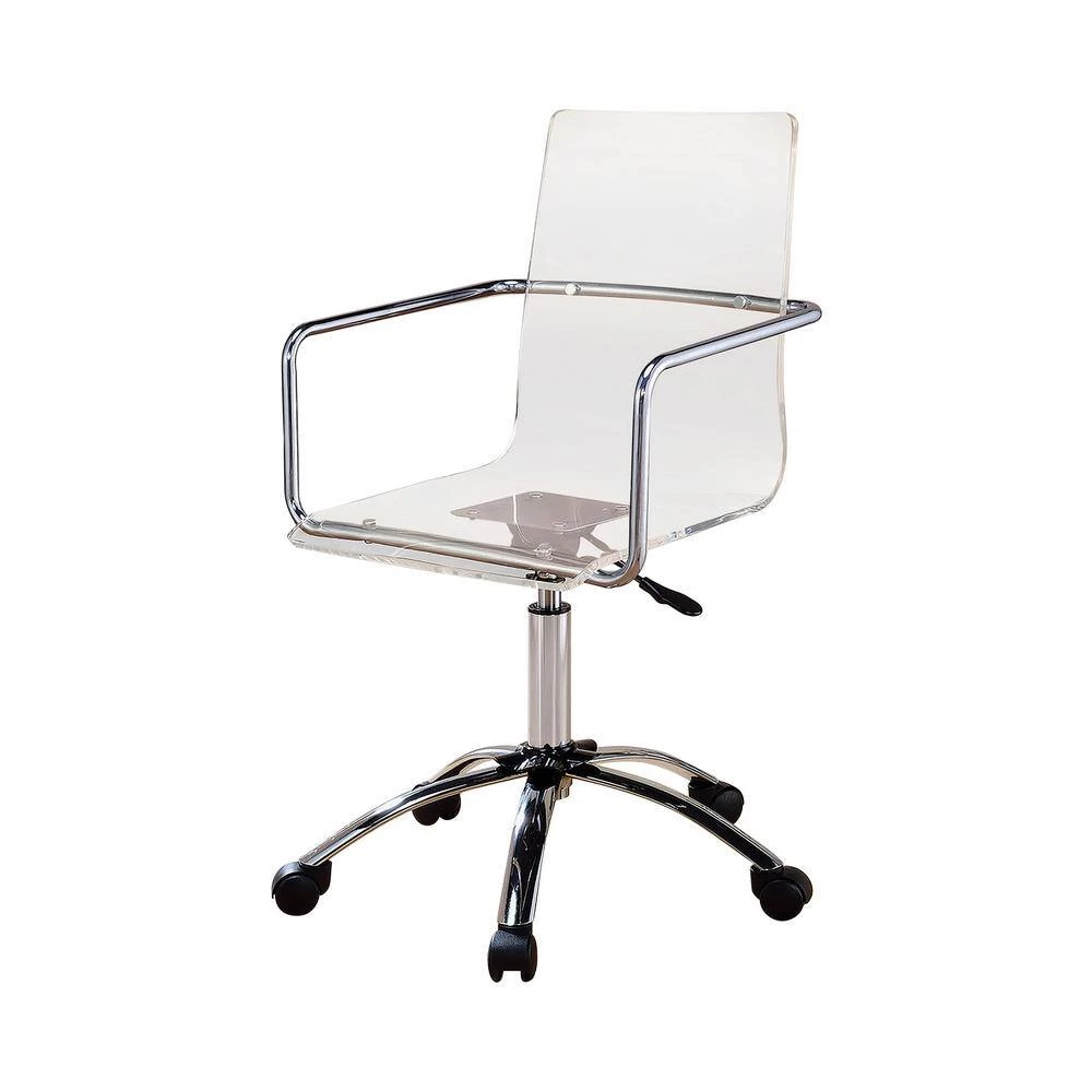 The office of the future is here today. Stylize a home or business workspace with a cutting edge chair. A molded seat and back crafted from clear acrylic add a breathtaking effect that energizes any room. Chromed steel constructs a solid base with caster wheels for optimal movement. Adjust seating positions to meet your needs and make this ultra-contemporary office chair a keeper.
