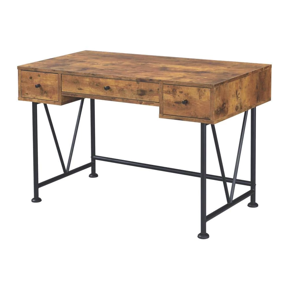 - Industrial home office writing desk with an antique nutmeg finish and black metal frame