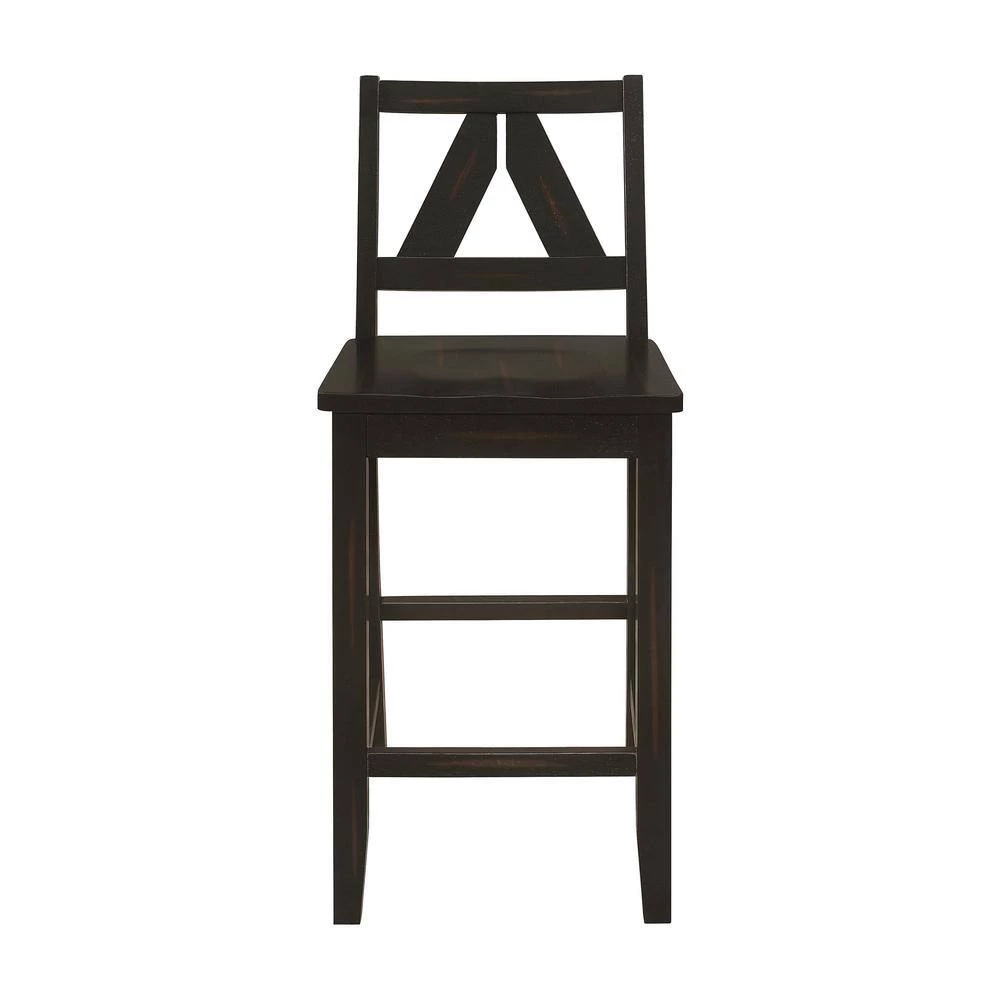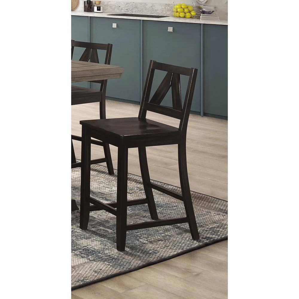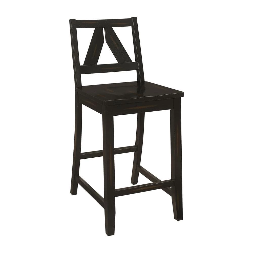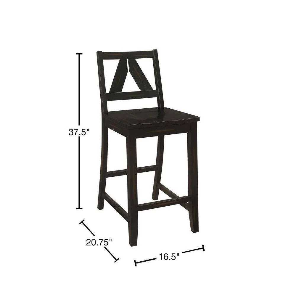 Add this pair of counter height stools to a transitional dining space or pub table for a bold design. Featuring a contoured wood seat that molds comfortably, you can enjoy hours of entertainment, activities and meals. Perfect for a modern farmhouse kitchen or dining space, this counter height stool displays a unique backrest design with an arrow-like motif of slanted wood planks. Footrests offer extra support and long, block style wood legs tapered gently at the foot. Throughout each chair is a black sand finish that offers a dark tone and subtle weathered design.