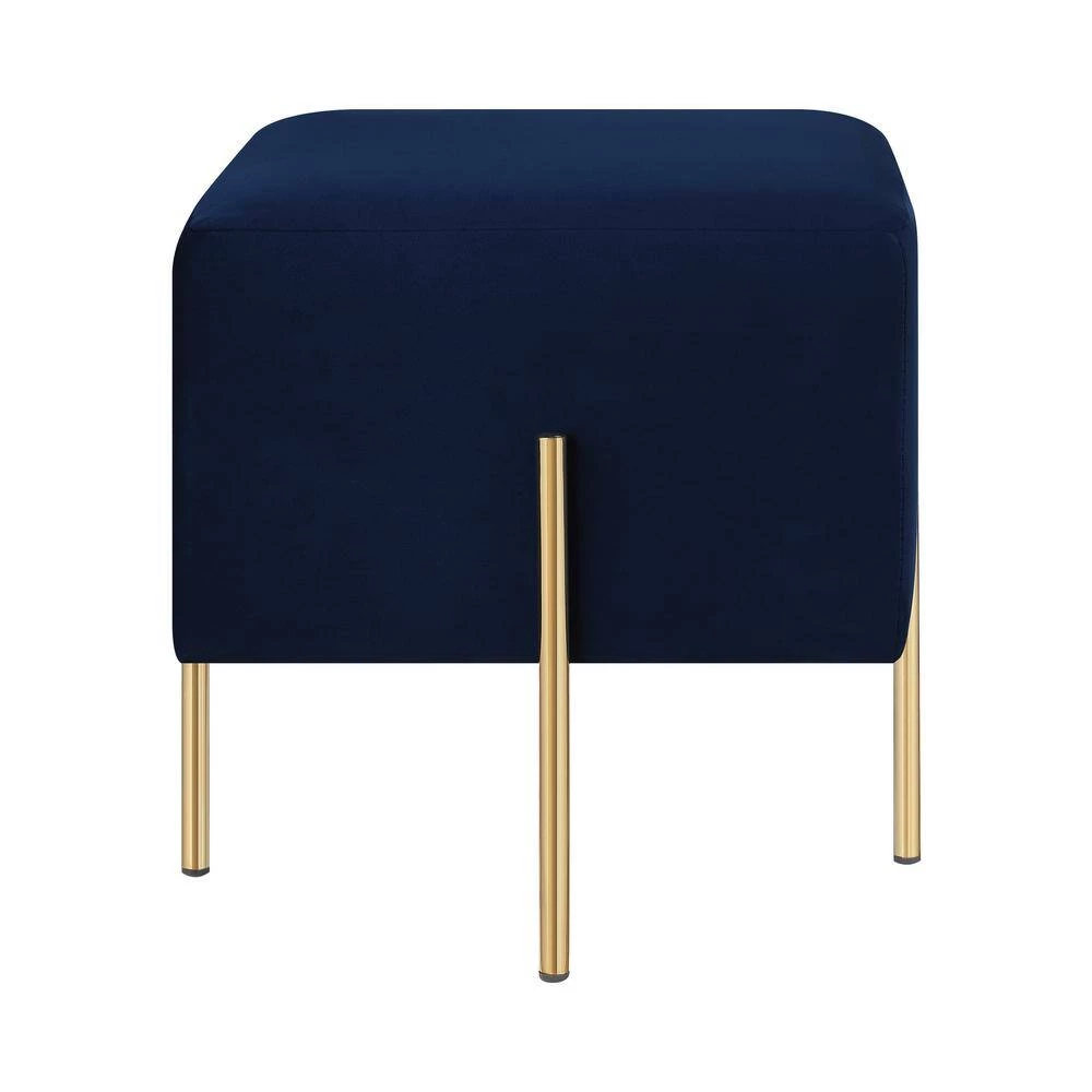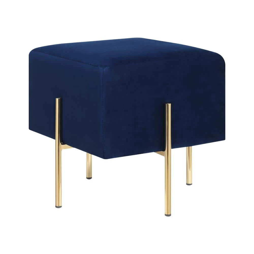 Full of glamour and rich hues, this modern blue ottoman is perfect for a chic space. Featuring a cushion with a geometric cube silhouette, this sleek ottoman fits in living rooms and bedrooms. The deep rich hue of the soft upholstery contrasts against the radiance of the metallic legs. The legs extend up past the cushion, providing support and giving it its luxurious personality. This plush, contemporary piece is bold in color and design.