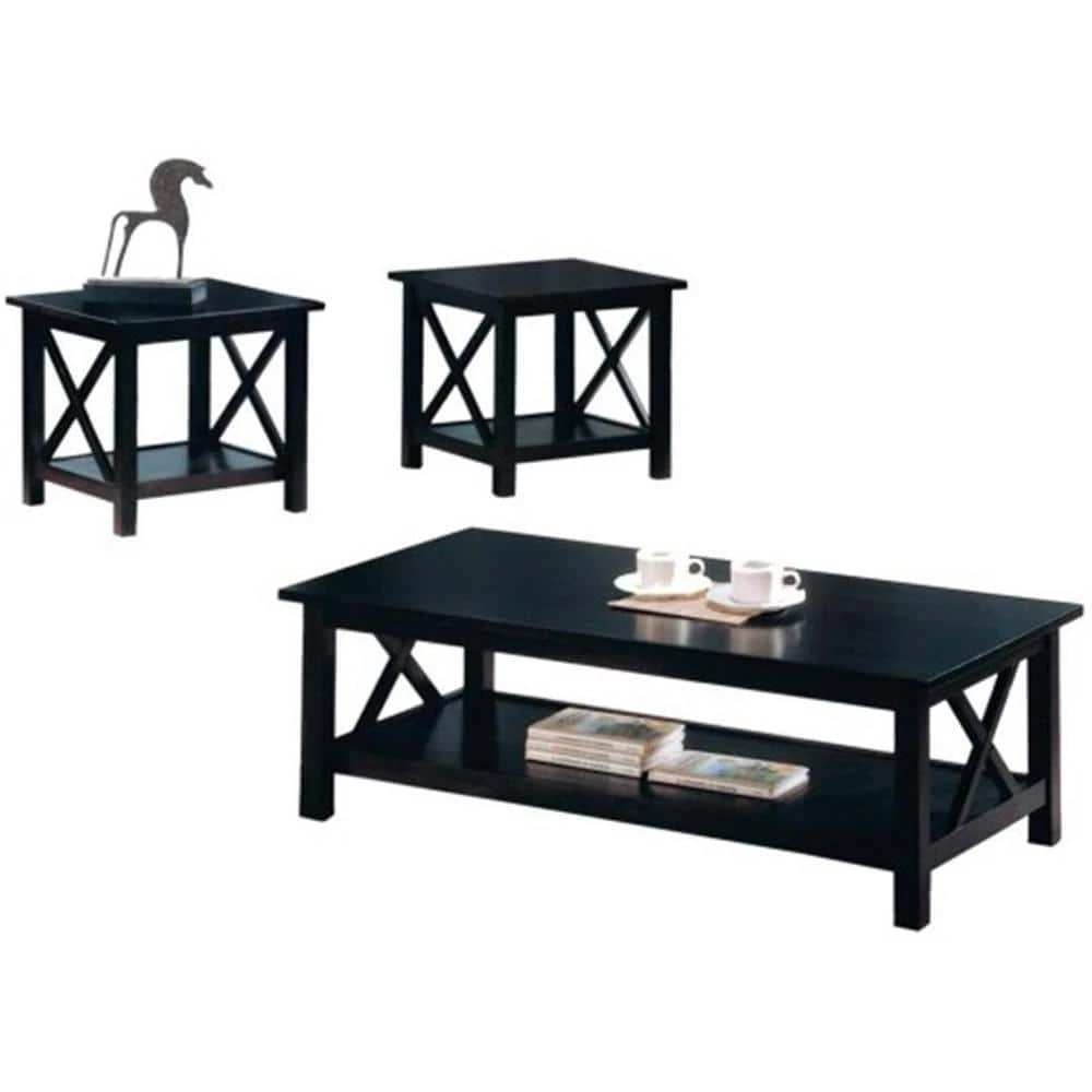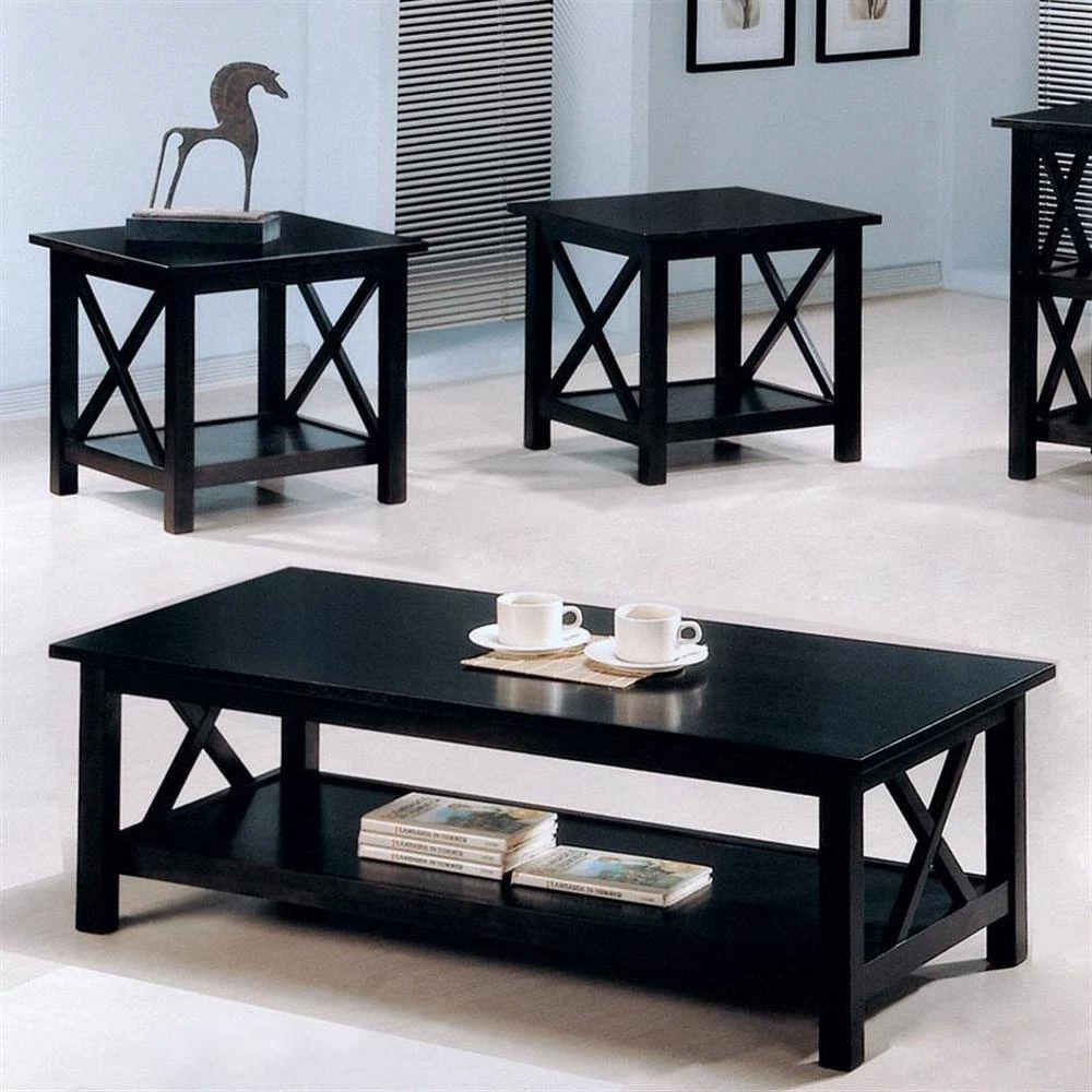 Transcending modern and traditional motifs, this three-piece set of occasional tables is an excellent choice for a transitional space. Stylish linear silhouettes feature an x-style frame on the end of each table. Finished in a deep merlot, it offers a gorgeous, bold look. Embellish a seating group with this set of a coffee table and matching end tables. Each offers storage and display on a lower shelf.