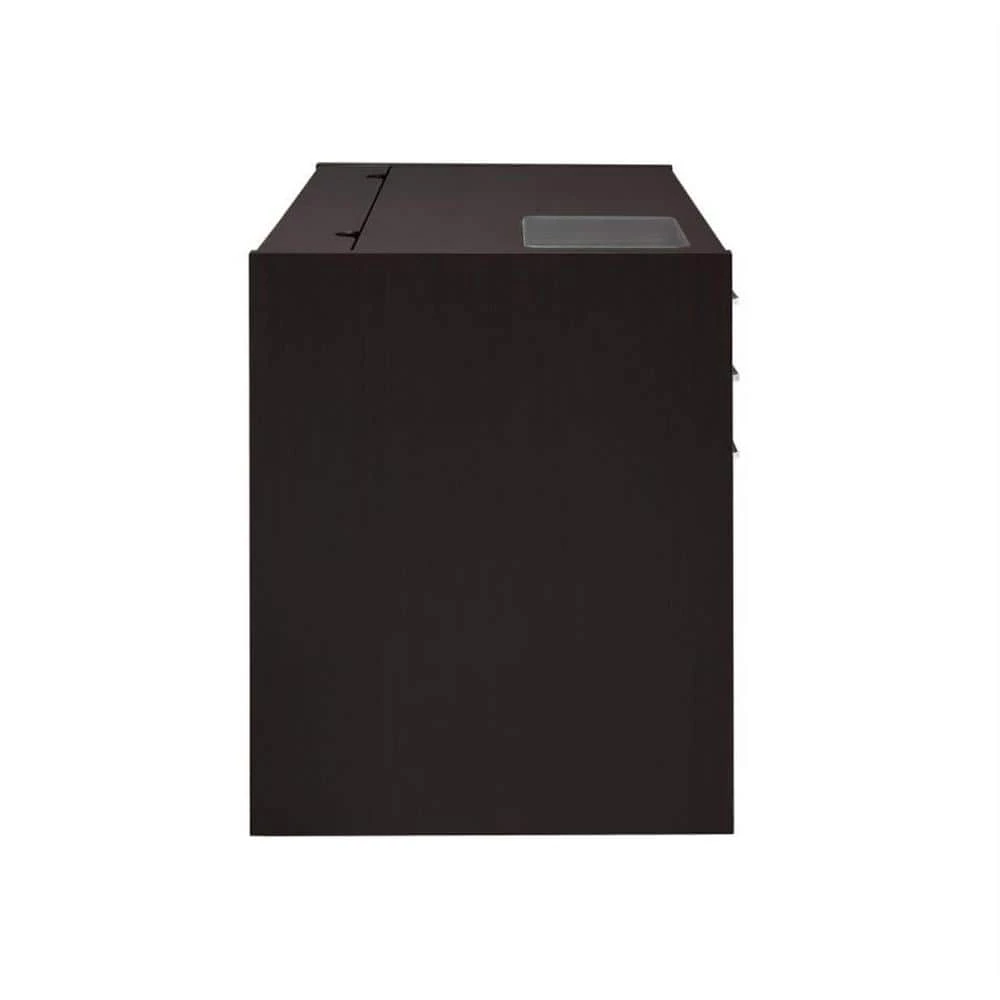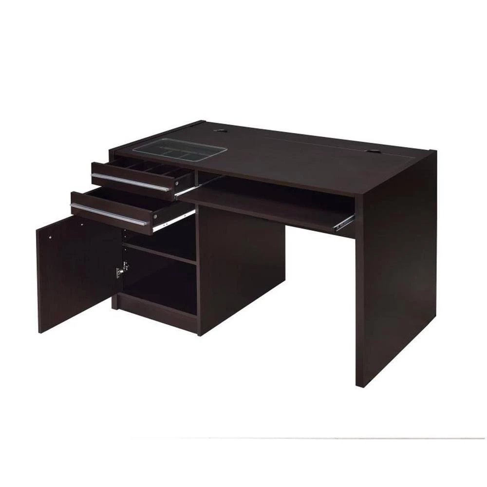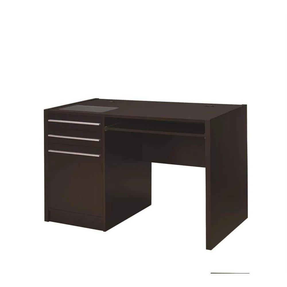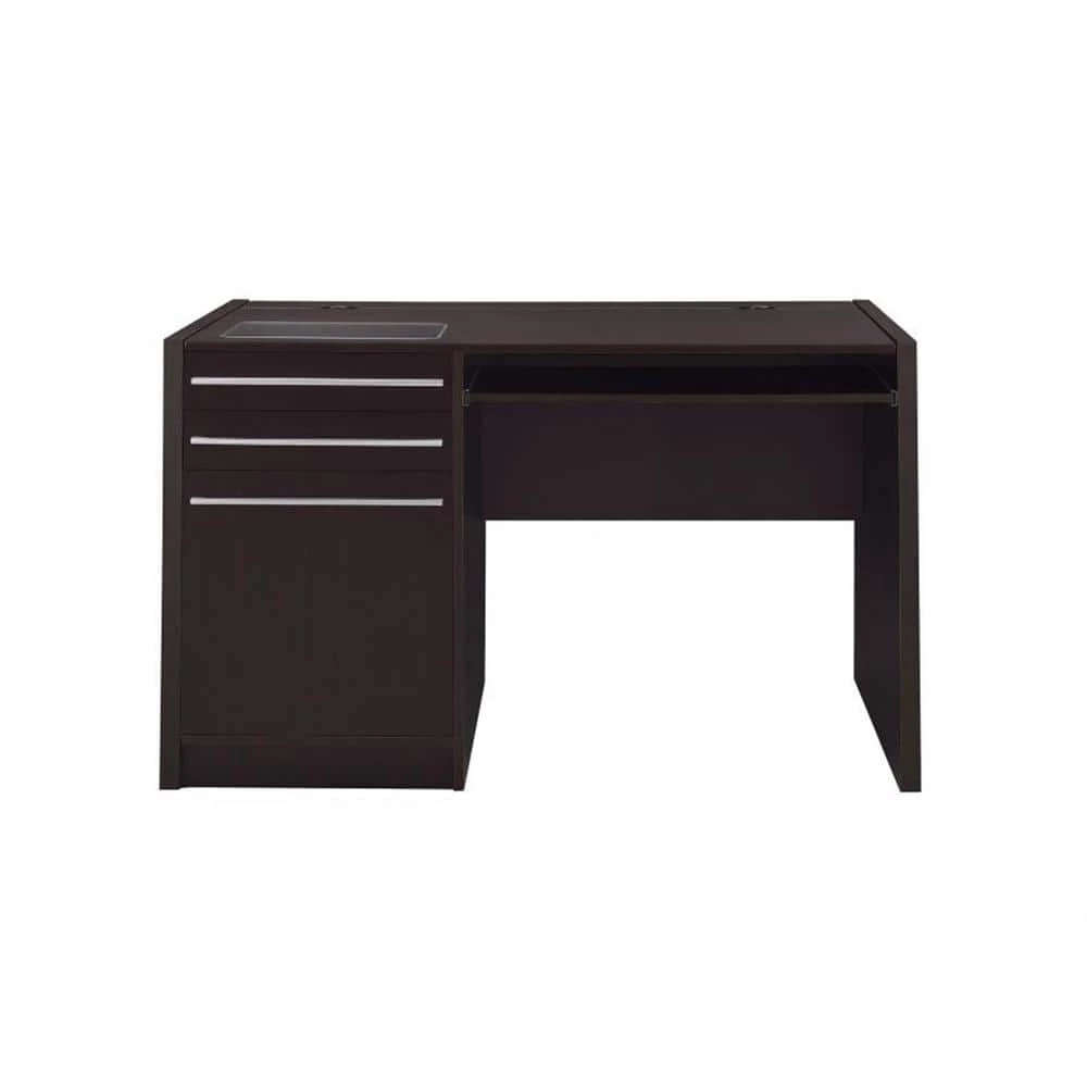 A basic piece with tasteful upgrades, this computer desk stays atop tech needs while offering a fresh, modular aesthetic. Finished in deep cappuccino, it offers versatility and bold style. Find everything you need for smooth computing, including two drawers and a keyboard drawer with Euro glides and a storage cabinet with an adjustable shelf. Components and devices are viewable through a clear tempered glass insert on the desktop. Enjoy the convenience of a power outlet within lift-top storage.